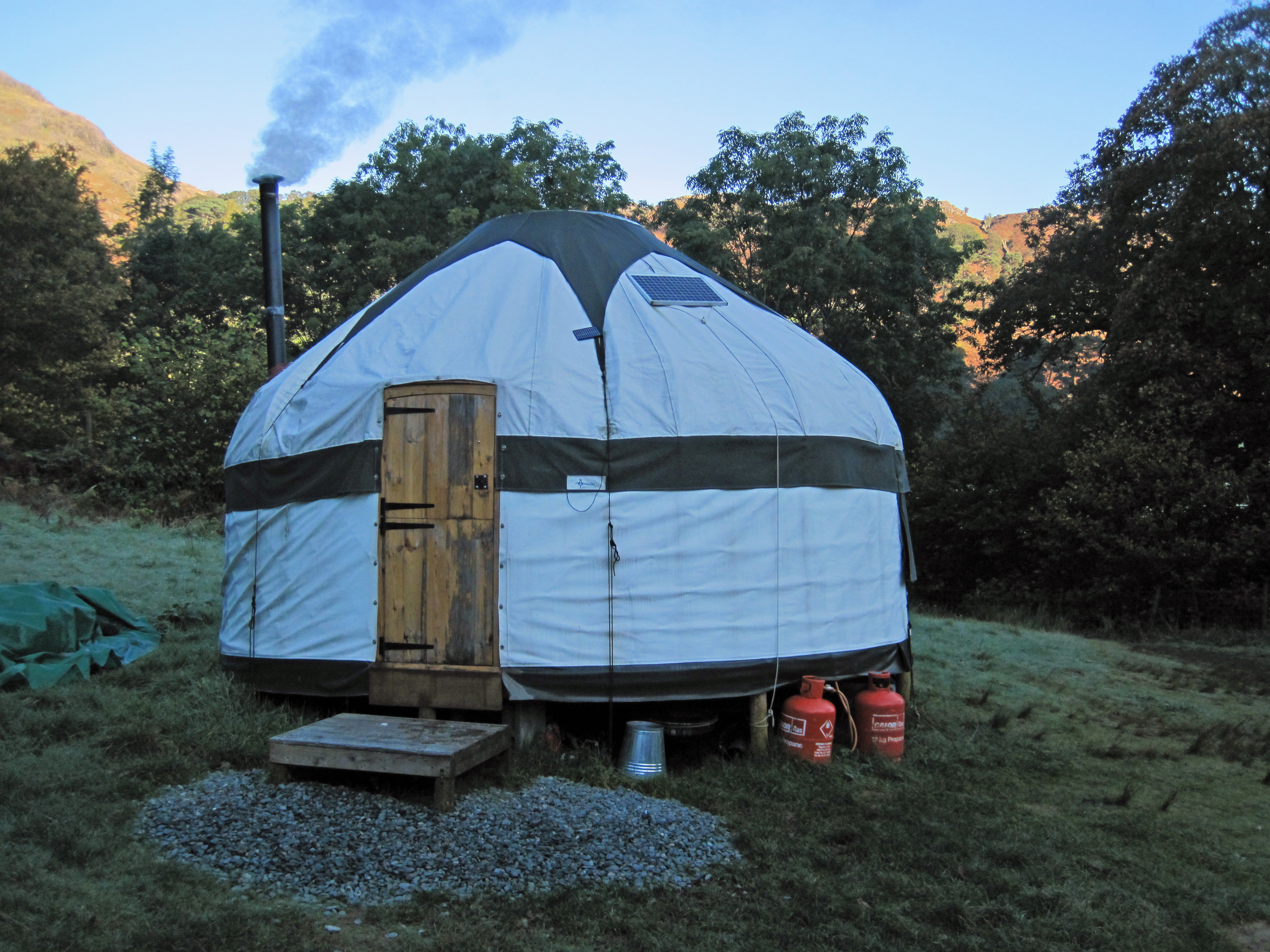 The next morning I opened the yurt door to see green fields, trees, a brilliant clear stream and the mountains of Borrowdale.  It was a great sight, made all the better by the fact that we were in the wettest part of England and it wasn’t raining.