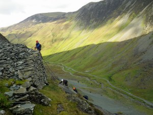 The via ferrata at Honister Slate Mine has only been there a few years and the “extreme” addition to it that we were doing had only opened earlier this year.  The Mine itself sits in the saddle of the Honister Pass between Borrowdale and Buttermere and the via ferrata makes its way up through the old mine workings to the top of Fleetwith Pike.  The Mine has a long history and has only recently redeveloped itself as a tourist attraction as well as a fully functioning mine.   (The Mine and the via ferrata are something that deserve, and will get, a fuller post at a later date.)