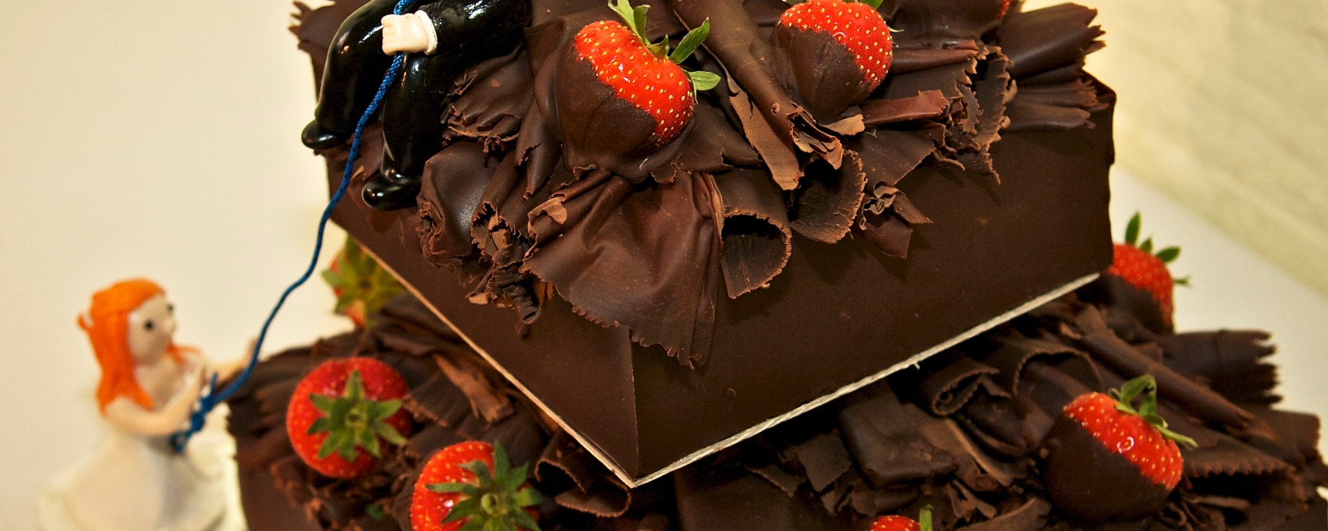 The entire cake was finished with more dark chocolate, chocolate shavings and giant, chocolate dipped strawberries.  A sort of chocolate mountain for the cake toppers.  The cake was made early on the morning by the Euphorium Bakery in London.