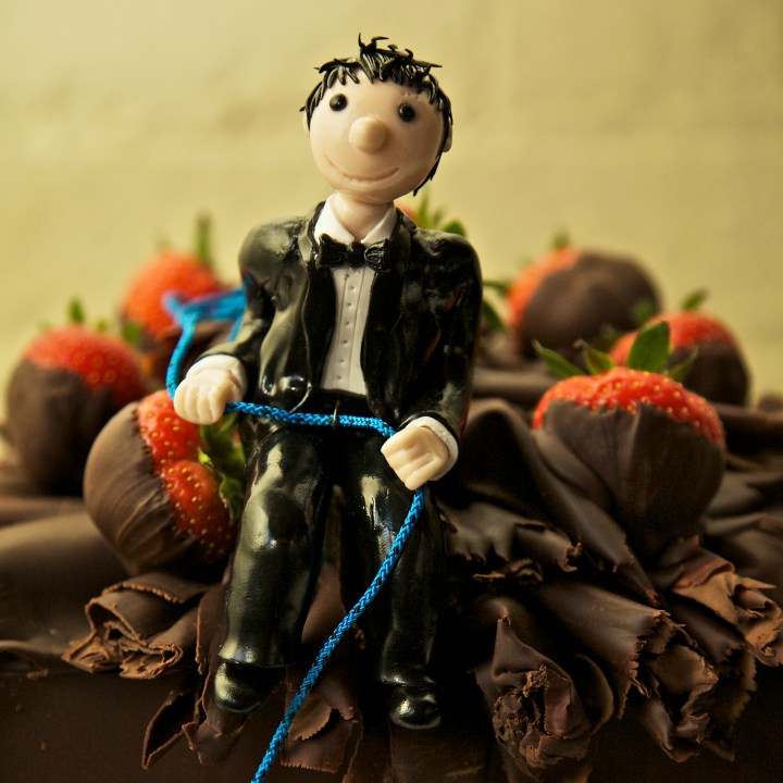 The rock climbing wedding cake toppers on the chocolate marquis.