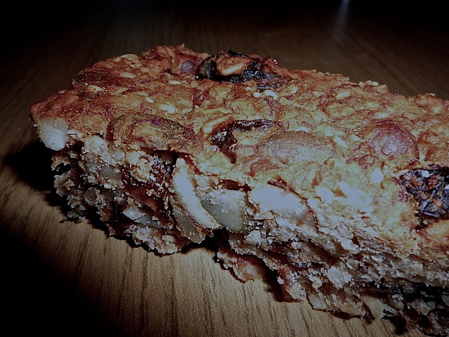 The humble banana, allowed to decompose, sorry, ripen, and beaten into a pulp with a potato masher was the answer to all that fat and sugar.  After many experiments, (mostly) happily eaten by Robin, I managed to put together a recipe which results in an oat, fruit and nut bar which is both soft, but firm enough to carry on the hill without falling apart.  The best part of it is that the recipe is surprisingly flexible.  You can use whatever fruit or nuts you’re partial to.  If you’re gluten intolerant, use rice flour.  If you’re vegan then this should also meet your criterion.  If you’re allergic to nuts… well, tough luck.  If you want it sweeter, just increase the proportion of fruit.  If you want it firmer, cook it for 5 minutes longer.