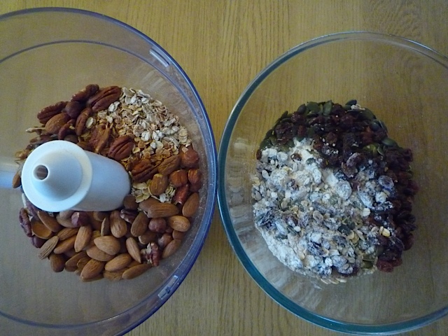 Chop in a food processor the 1 cup of jumbo oats and nuts.  If you’ve brought oatmeal or pre-bashed nuts, then skip this stage and add into the step before.  If you want your cereal bars quite sweet, add in the dried fruit to this stage and chop them lightly.Mix and process ingredients
