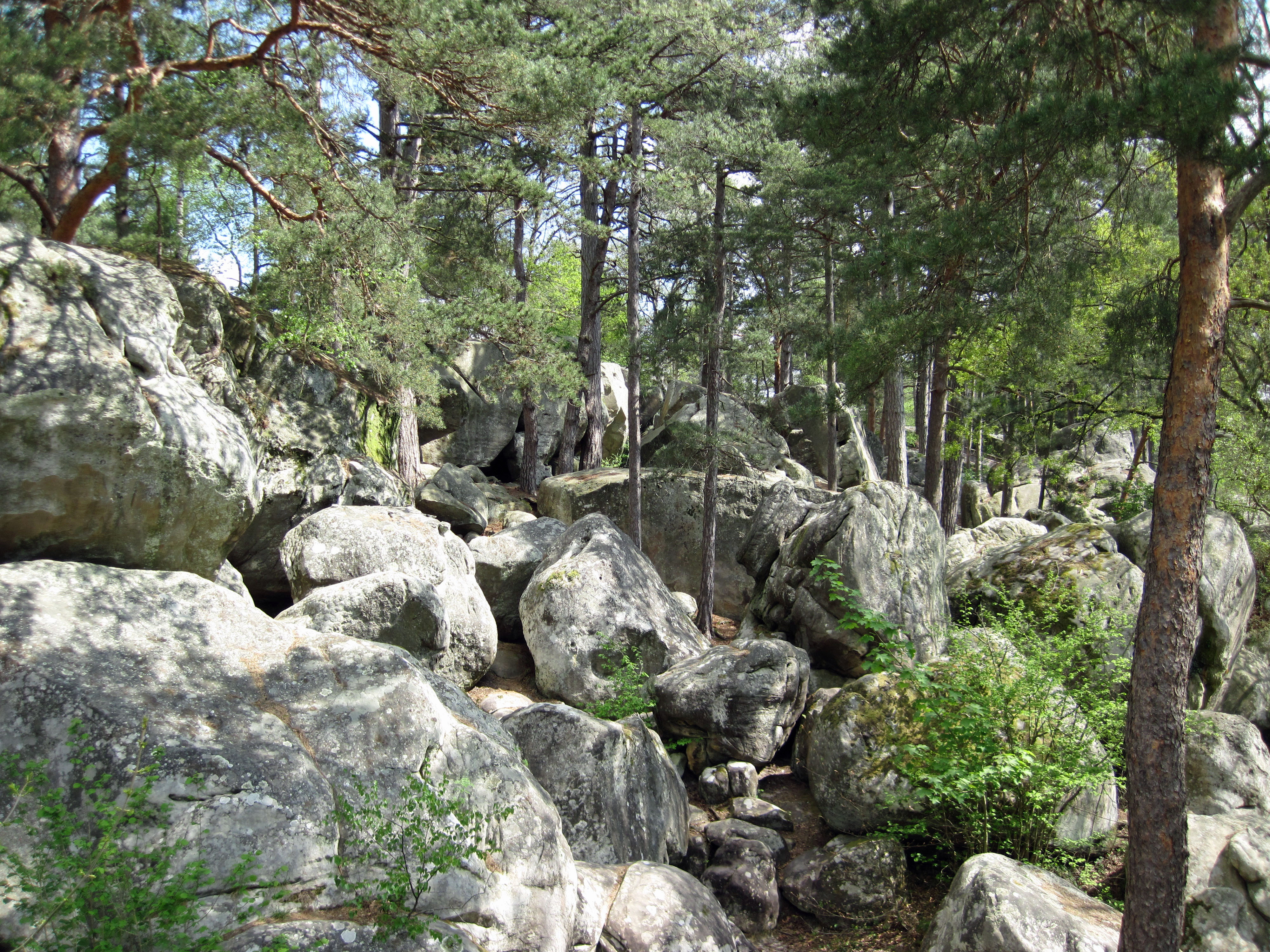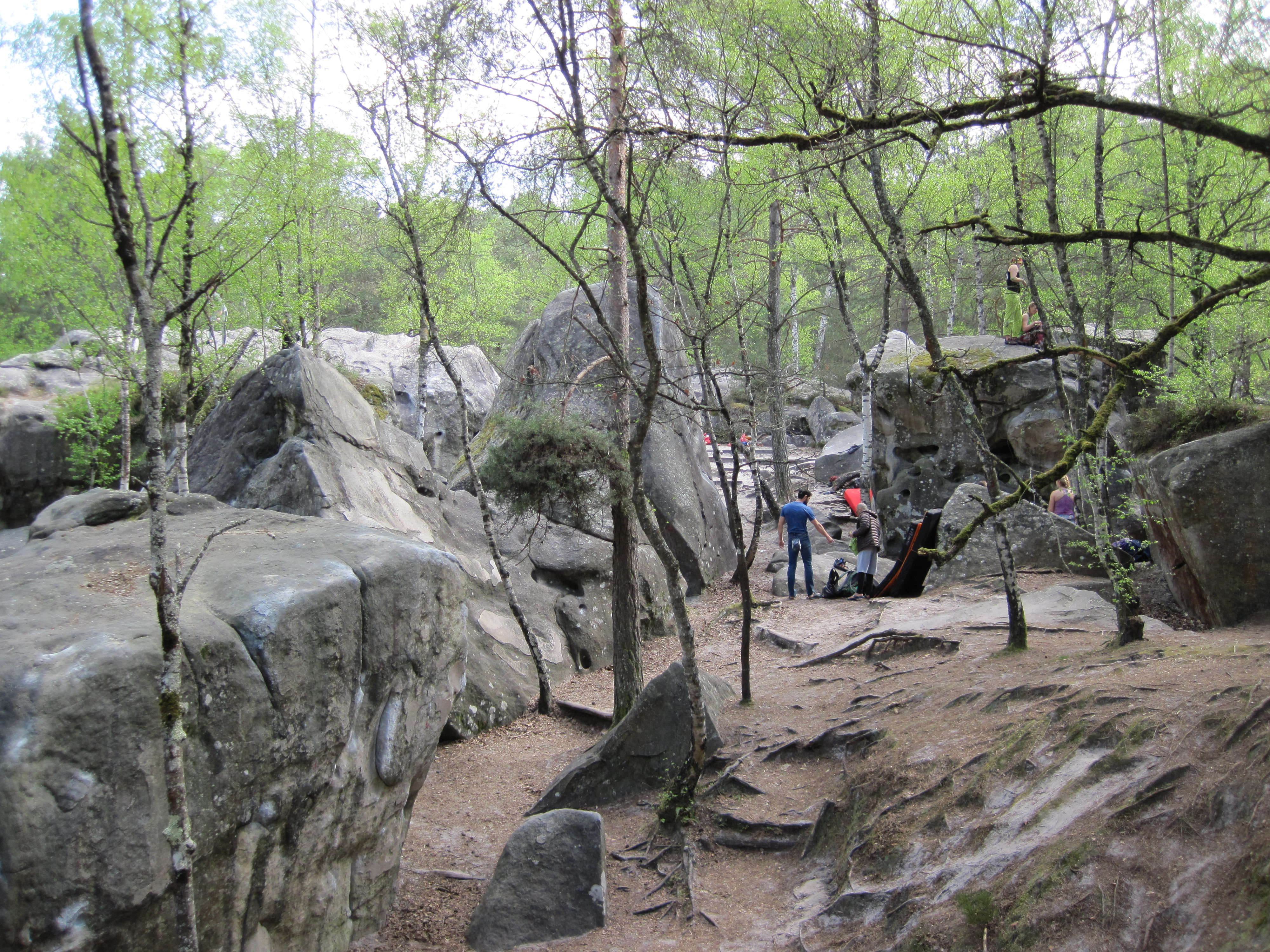 Rocher aux Sabots is a mix of relatively flat areas and up-and-down and rocky areas. The large numbers of boulderers make it fairly easy for a toddler to wander under someone climbing. If you are looking for a place to set up camp, then head just up hill of the Jet Set area as this has a nice area of sand slightly away from the actual climbing.