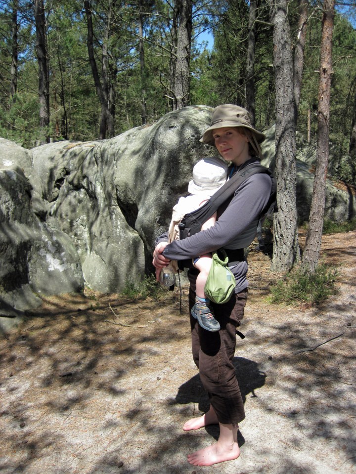 All that climbing, running about and digging in the sand is pretty tiring. Organising naps was a fairly big part of our first trip to Fontainebleau when Leo was a baby and on our second trip, when he was about he was 21 months old. Working out how to take a toddler to a bouldering venue for most of the day and find an opportunity for him to have his afternoon nap is challenging. Valerie curling up with Leo on the picnic blanket so that he can have his nap worked on the one day we that did it, but I think that was only successful because there weren’t many people about. A better alternative was to put Leo in the ErgoBaby and walk gently around with him until he fell asleep. This meant that someone had to wear Leo until he awoke from his nap, but we approached this like a long turn of taking care of Leo and followed it up with a long turn climbing.
