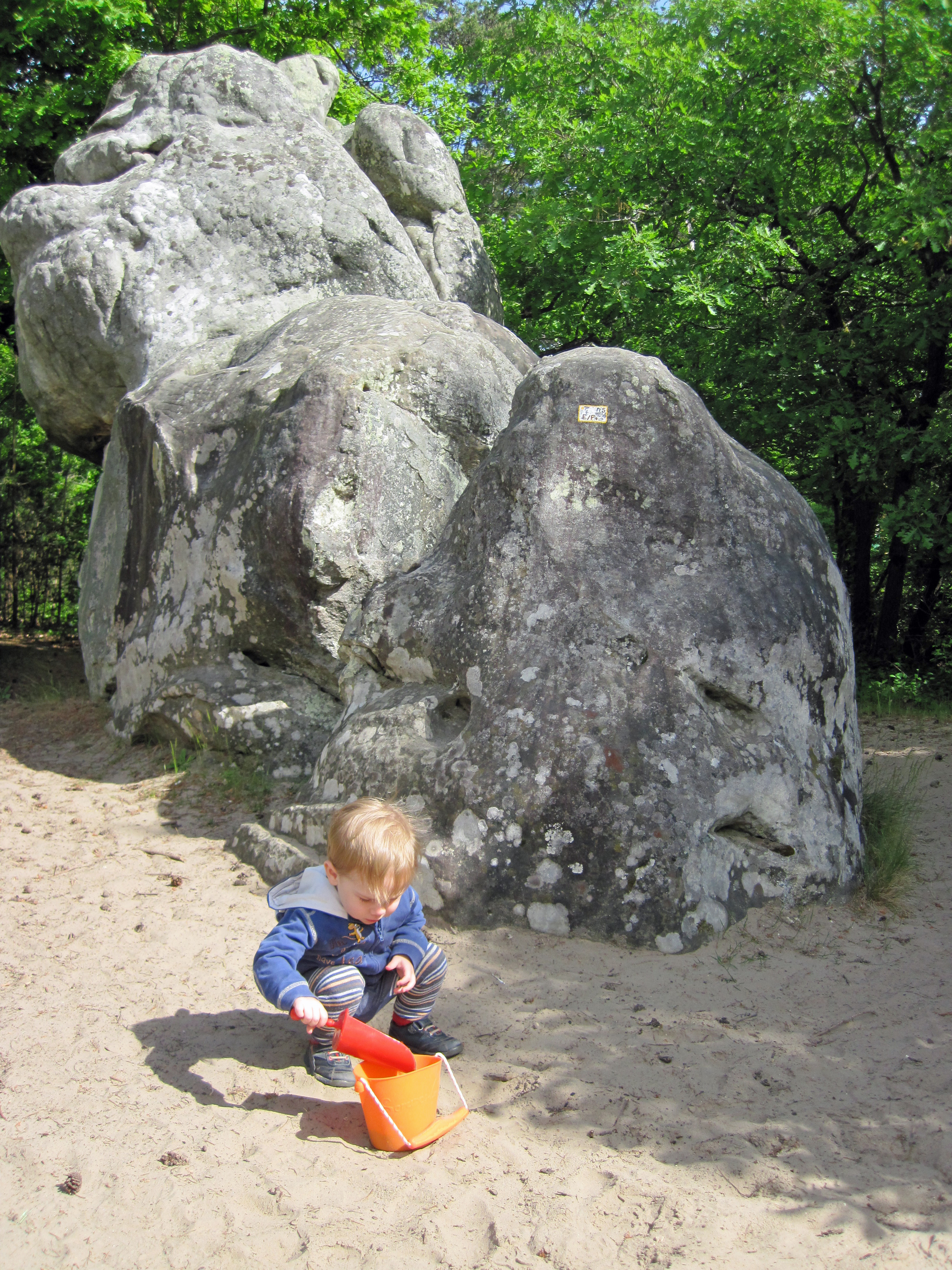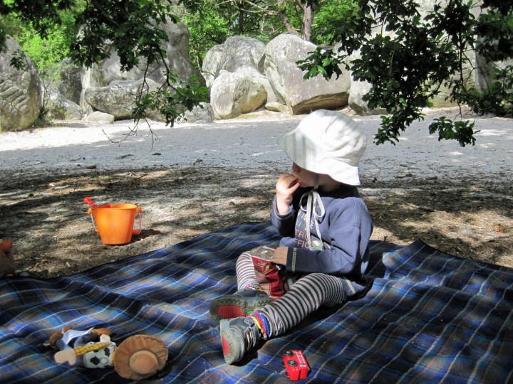 The boulders at Fontainebleau are sandstone and that means lots of sand. This makes for better landings when bouldering and for clearings in the forest that are like inland beaches. These clearings are a great place to set up camp for the day. We would throw a picnic blanket down under some trees on the edge of one of these clearings and Leo would contentedly play in the sand with a bucket and spade, burying his toys.