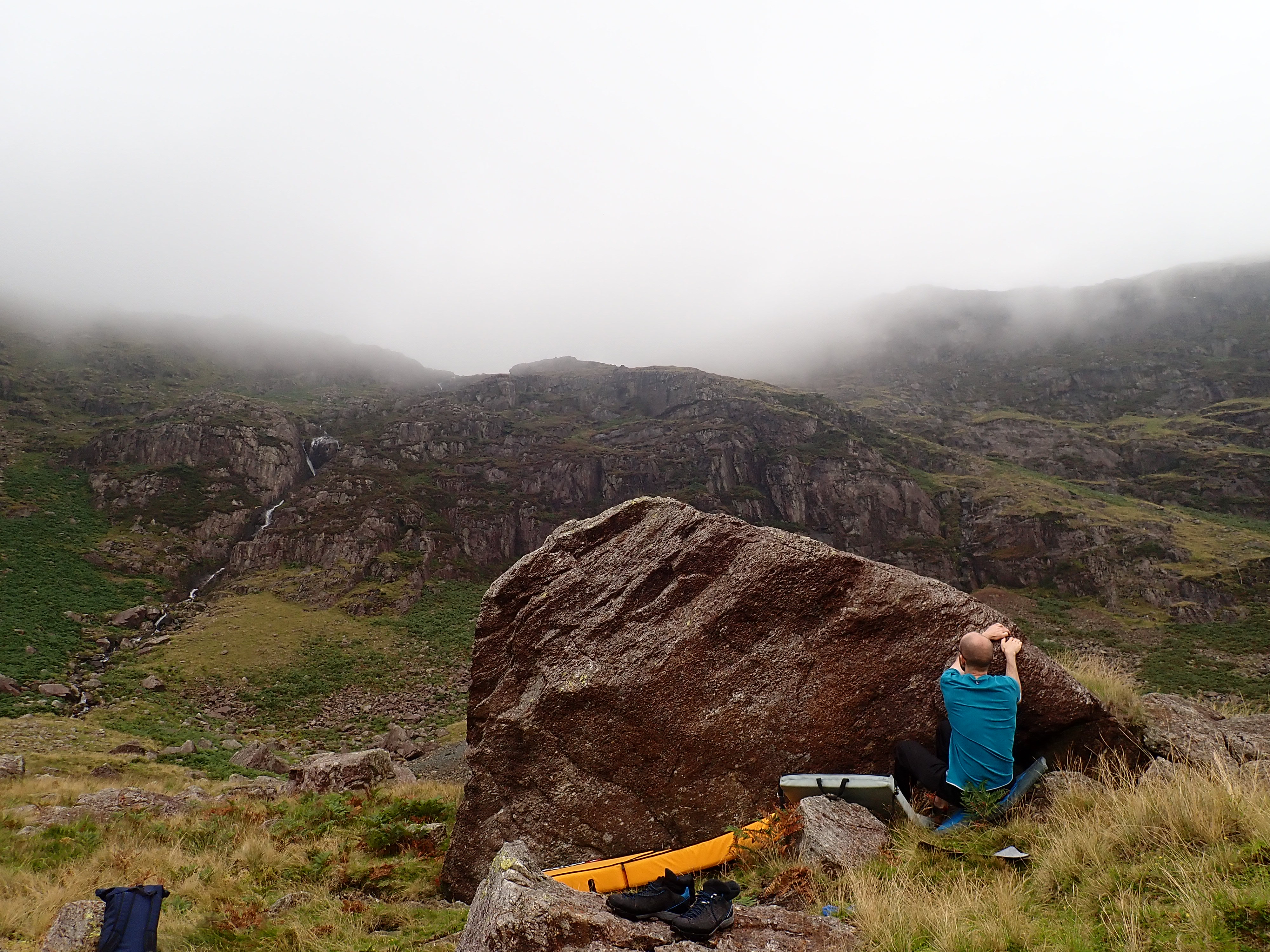 By the time I parked at the rough car park on the slopes of the Old Man of Coniston on my first day of climbing, the cloud was low and it was lightly raining.  The forecast said it would clear up later, and so I was optimistic of a good day as I headed out for Boulder Valley.  The guidebook showed Boulder Valley as a spread-out boulder field in the Coniston Coppermines Valley, in the shadow of the Old Man of Coniston.  The mountain setting, with a good selection of lower grade problems, made it look great as a first day venue.