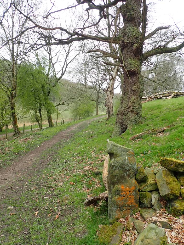 The route left the farm behind to follow the edge of a plantation. This sat above what my map and the signs said was Beaver Bank Reservoir, but which seemed to be devoid of water while being full of grass and young trees. I stopped for a snack in a pretty location by a gatepost dated 1710. A herd of deer and a hare went by while I ate my cereal bar, and the sun came out. Those few minutes were a highlight of the walk.