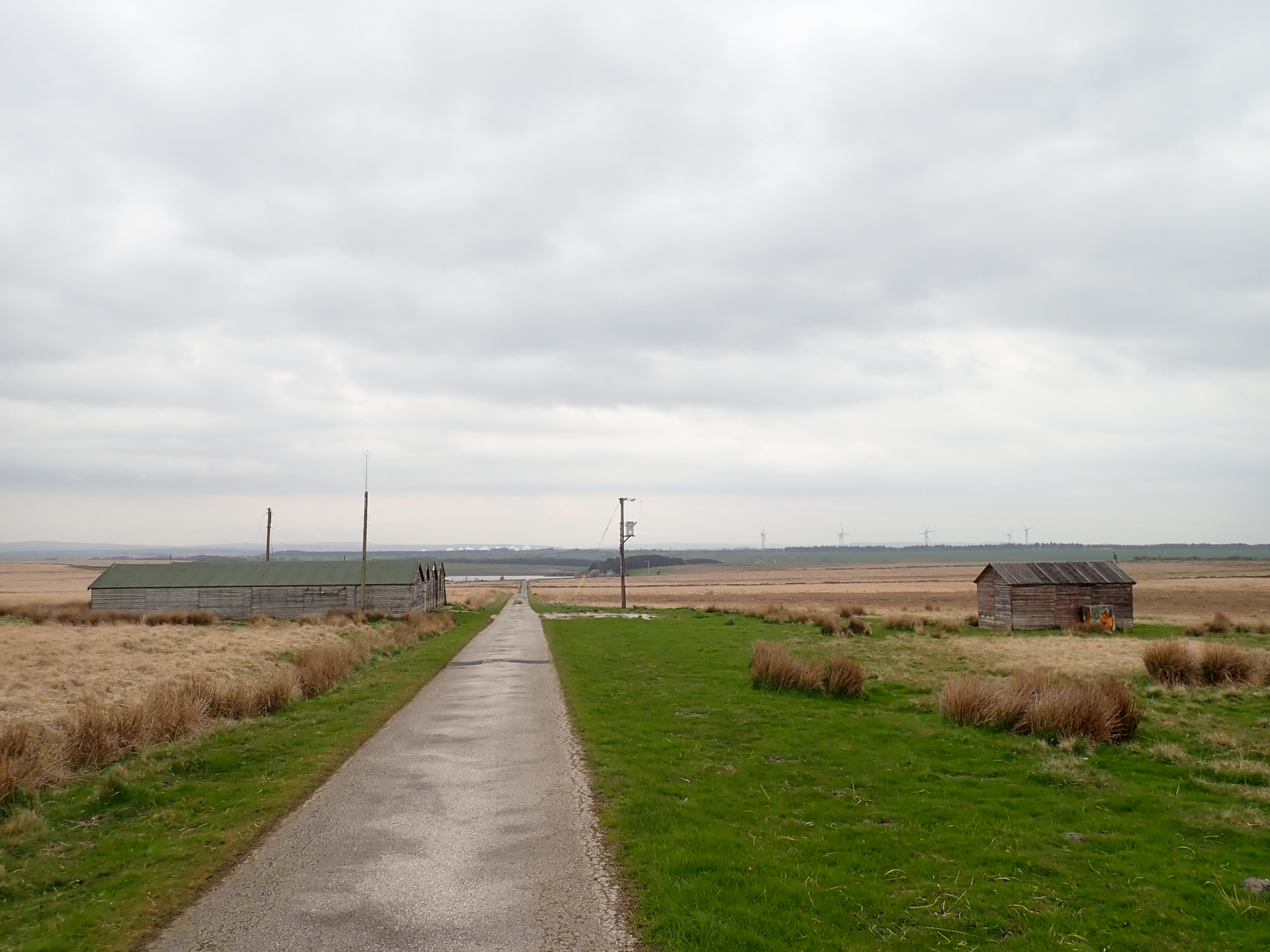Huts used by the University of Leeds in its Haverah Park experiment on the Scargill Reservoir access road. Menwith Hill and the Knabs Ridge wind farm are in the distance.