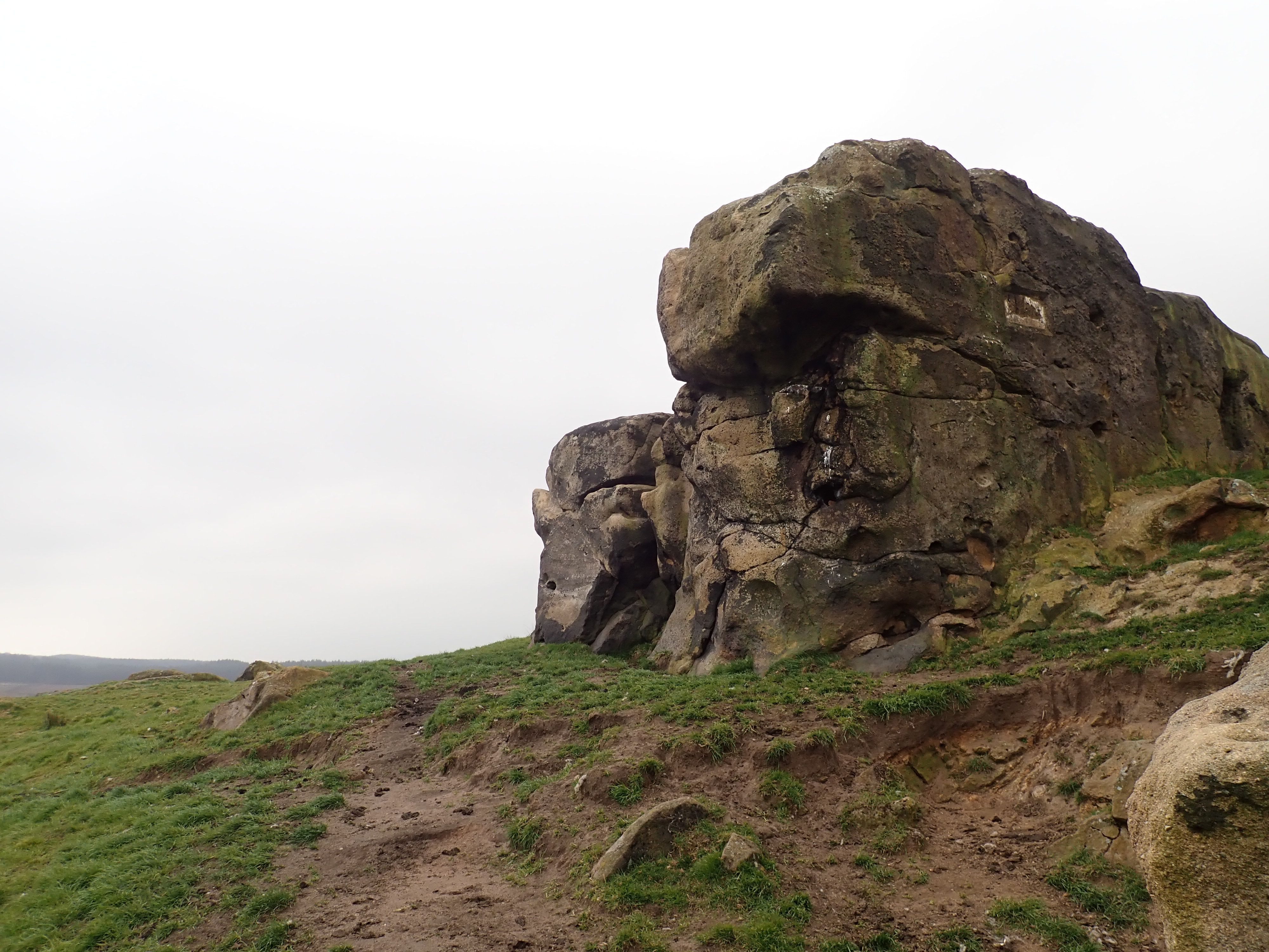 Eventually I reached Little Almscliff. This is a gritstone outcrop on a small rise that does look like a miniature version of its bigger brother a few miles to the South-East. It was exposed to a cold wind and the views were obscured by a grey haze when I was there. However, on a warm, sunny day Little Almscliff must be a good mini venue.  The rock is full of interesting cracks and other features, and my guidebook shows a surprisingly large number of easier bouldering problems on its short walls.