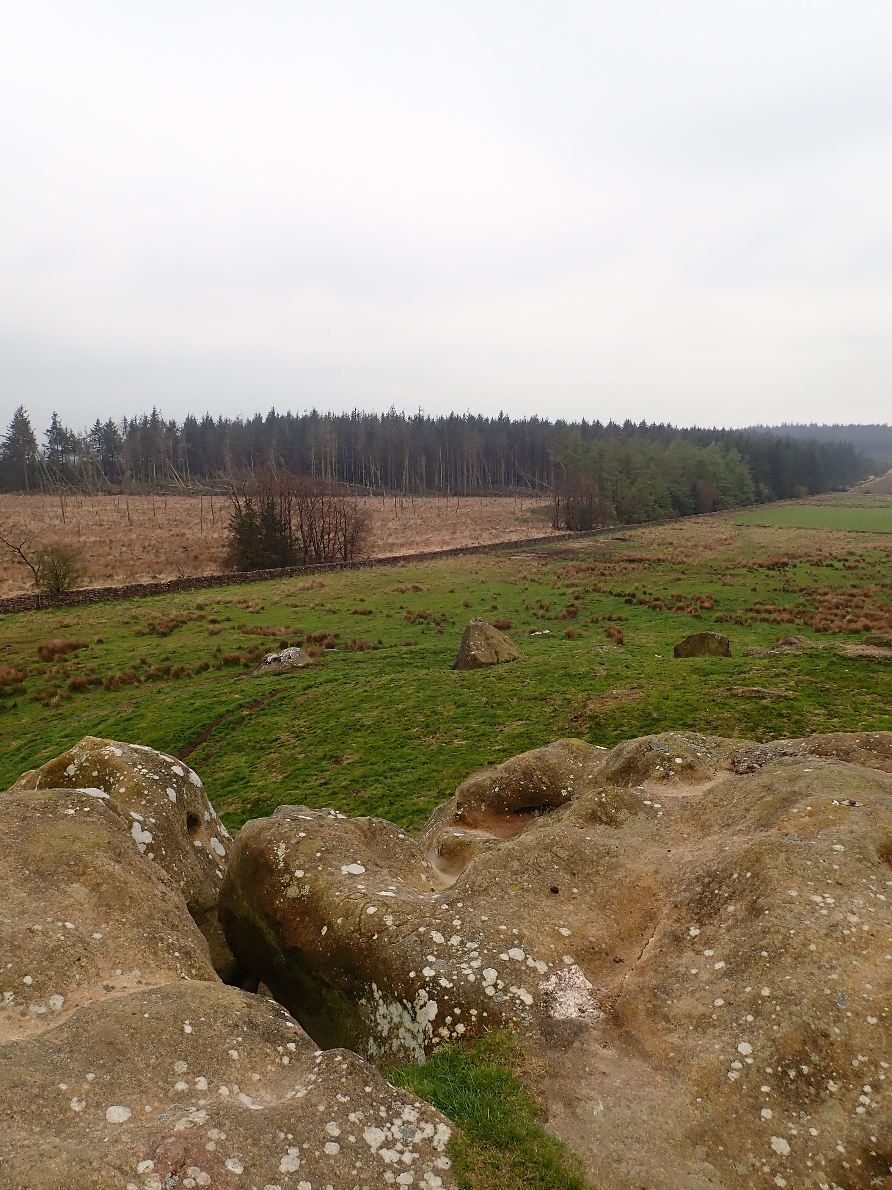 The route left the farm behind to follow the edge of a plantation. This sat above what my map and the signs said was Beaver Bank Reservoir, but which seemed to be devoid of water while being full of grass and young trees. I stopped for a snack in a pretty location by a gatepost dated 1710. A herd of deer and a hare went by while I ate my cereal bar, and the sun came out. Those few minutes were a highlight of the walk.