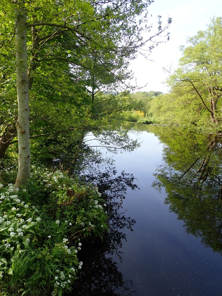 Pateley Bridge at 8:30 on a Sunday morning was very peaceful. This was good for me as it meant there was no one around to see me getting confused in a side street. Once I was past that, the Nidderdale Way was stunning. The first part closely followed the tree-lined Nidd through meadows and small woods. Among the trees were vast numbers of flowering wild garlic and patches of bluebells. The river was so still it looked like it wasn’t flowing at all, with its surface only disturbed by the occasional fish raising its head.