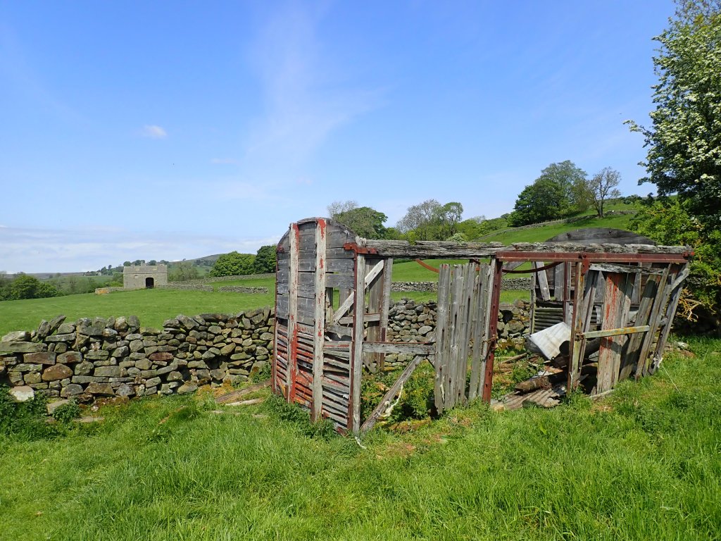 As I went through fields on the last stretch of the walk, I passed the skeletal remains of a railway goods wagon. It was presumably a relic of the Nidd Valley Light Railway that had been left as a shelter for sheep, but its collapsed roof and many missing boards meant it was not fulfilling this function anymore.