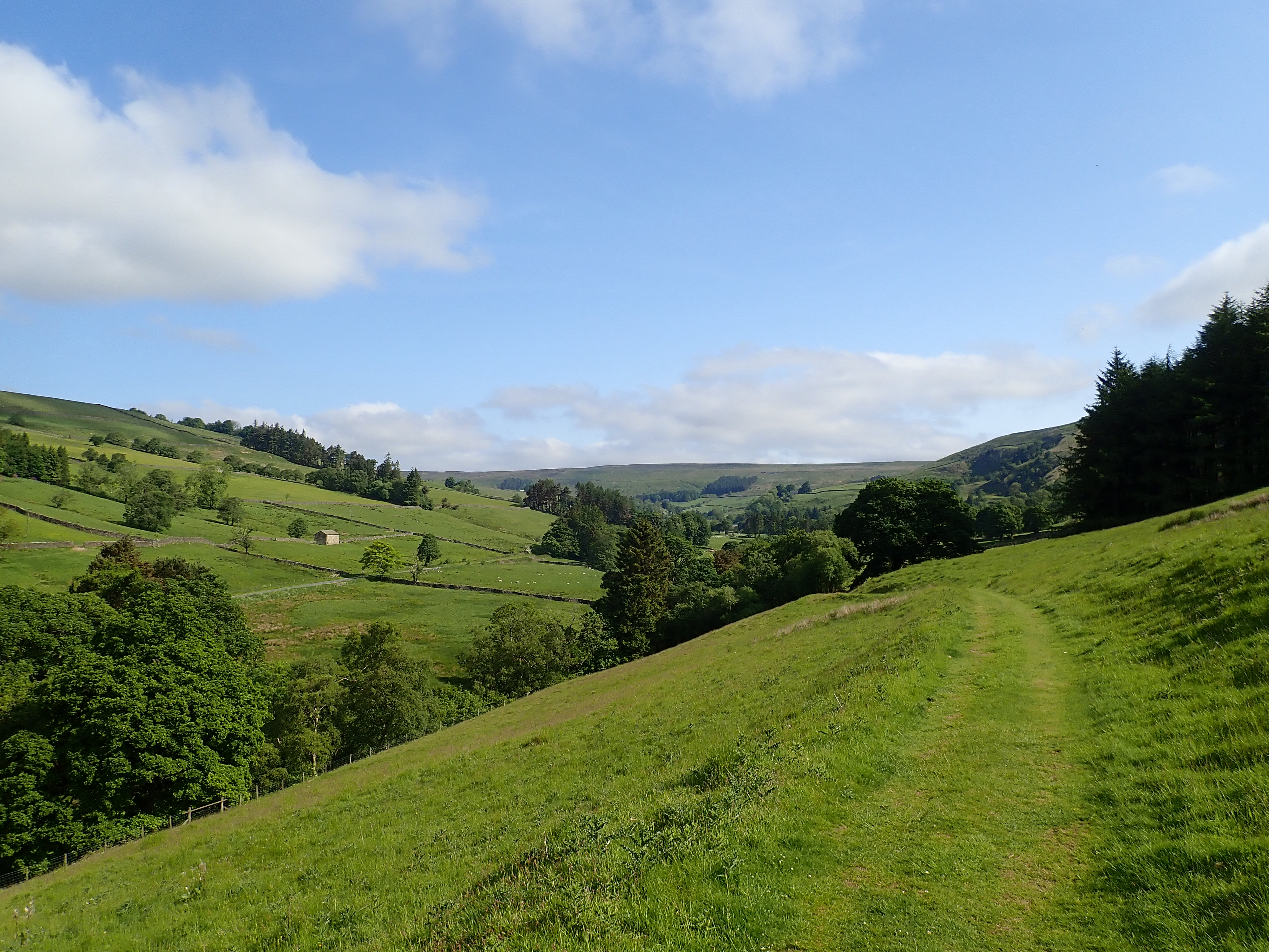 After my detour to the caves, I headed back to Limley Farm for a climb up the East side of the dale and then on to pass Thwaite House. This was the first of a series of houses that looked like they had started life as farm buildings before being converted into expensive houses with amazing views. From Thwaite House the Nidderdale Way followed a well-maintained track that traversed the dale as it turned sharply left to change from running North-South to East-West. I followed this track for about a mile and a half, enjoying the views along the dale and towards Scar House Dam.