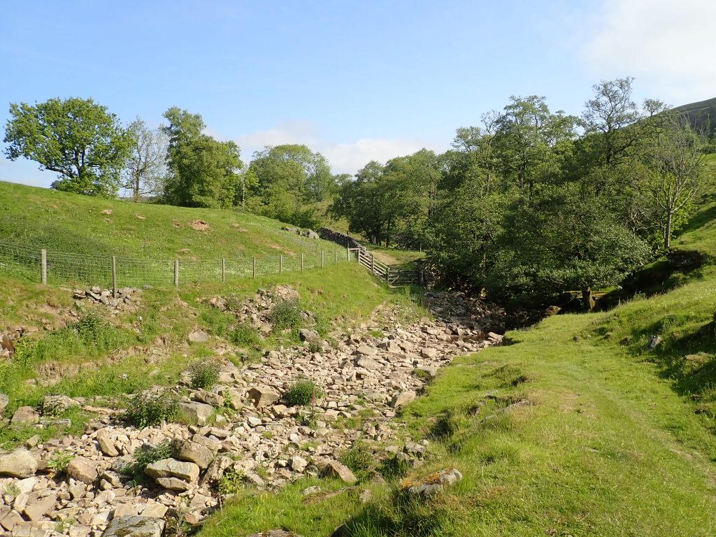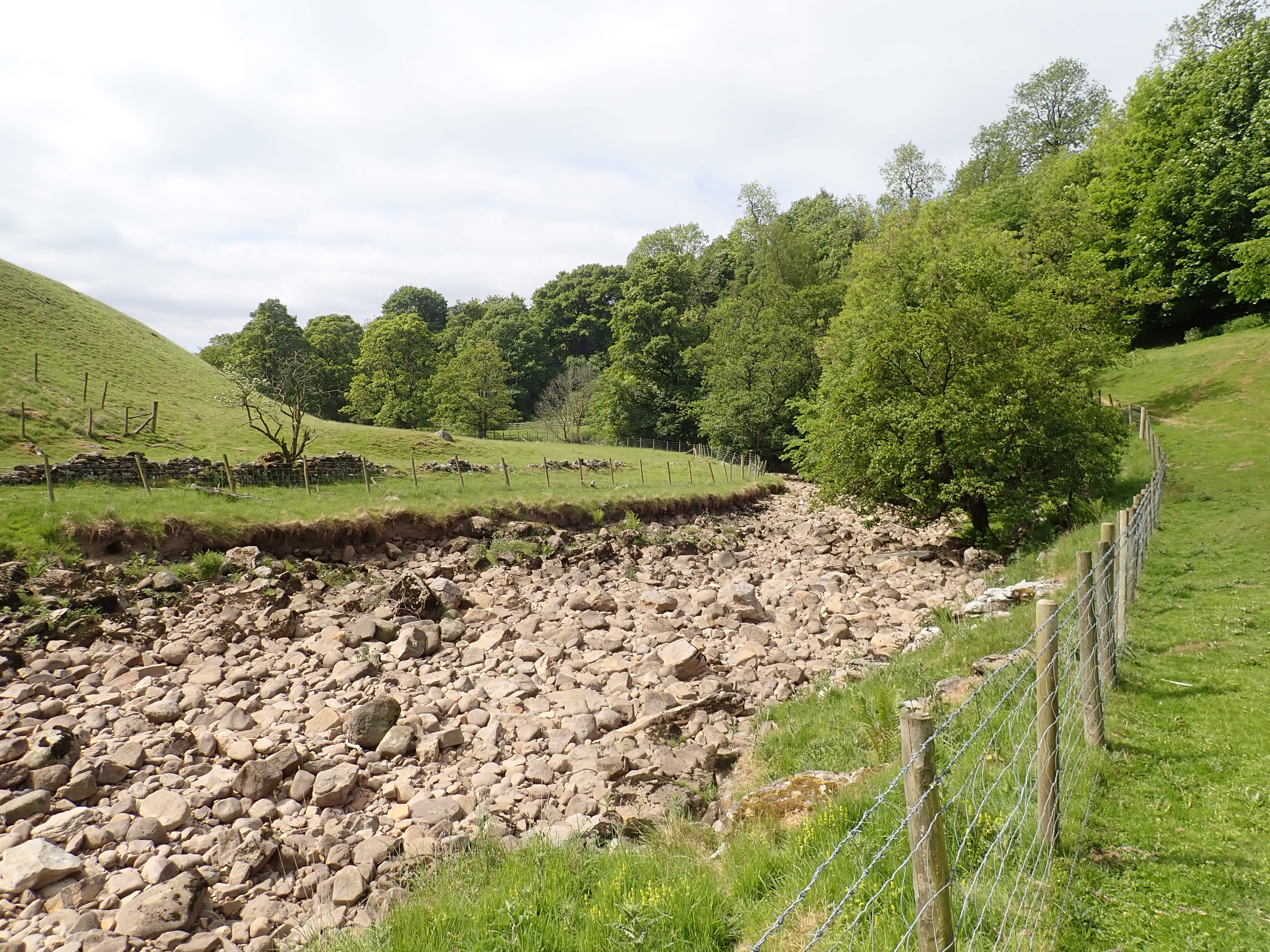 The dry bed of the Nidd downstream from near Manchester Pot.