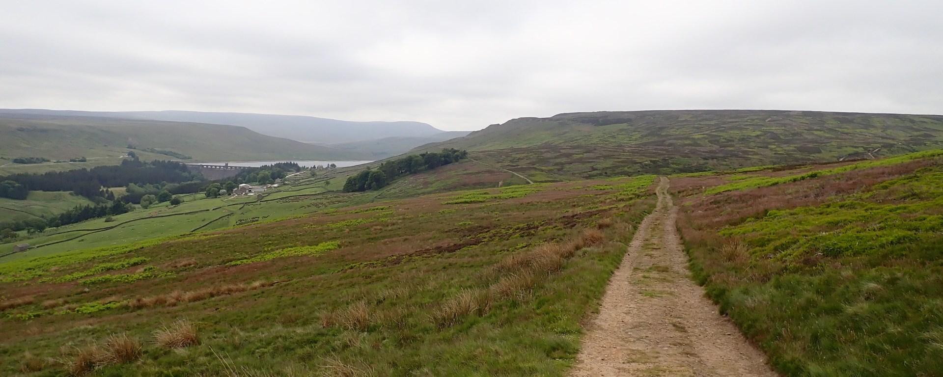 The Nidderdale Way as it crosses North Moor, with Scar House Reservoir and Great Whernside in the distance to the left.
