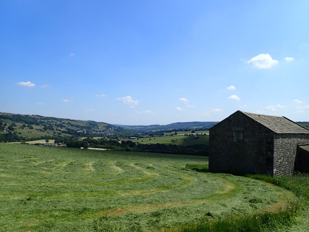 I first went up a ridge to a viewpoint overlooking the dale and fields with freshly cut hay waiting to be collected. I then went down the other side of the ridge, passing through hay meadows and close to a farm where the hay was being gathered into bales.