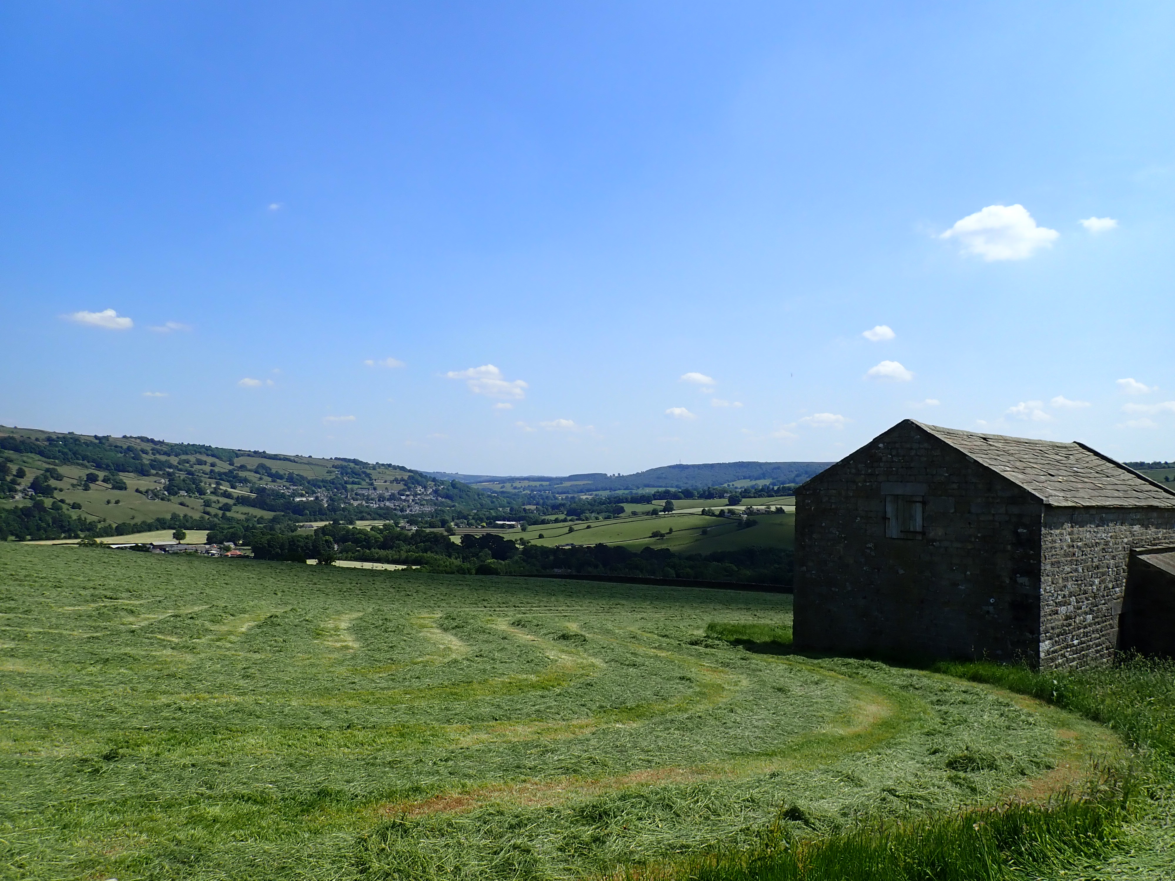 I first went up a ridge to a viewpoint overlooking the dale and fields with freshly cut hay waiting to be collected. I then went down the other side of the ridge, passing through hay meadows and close to a farm where the hay was being gathered into bales.