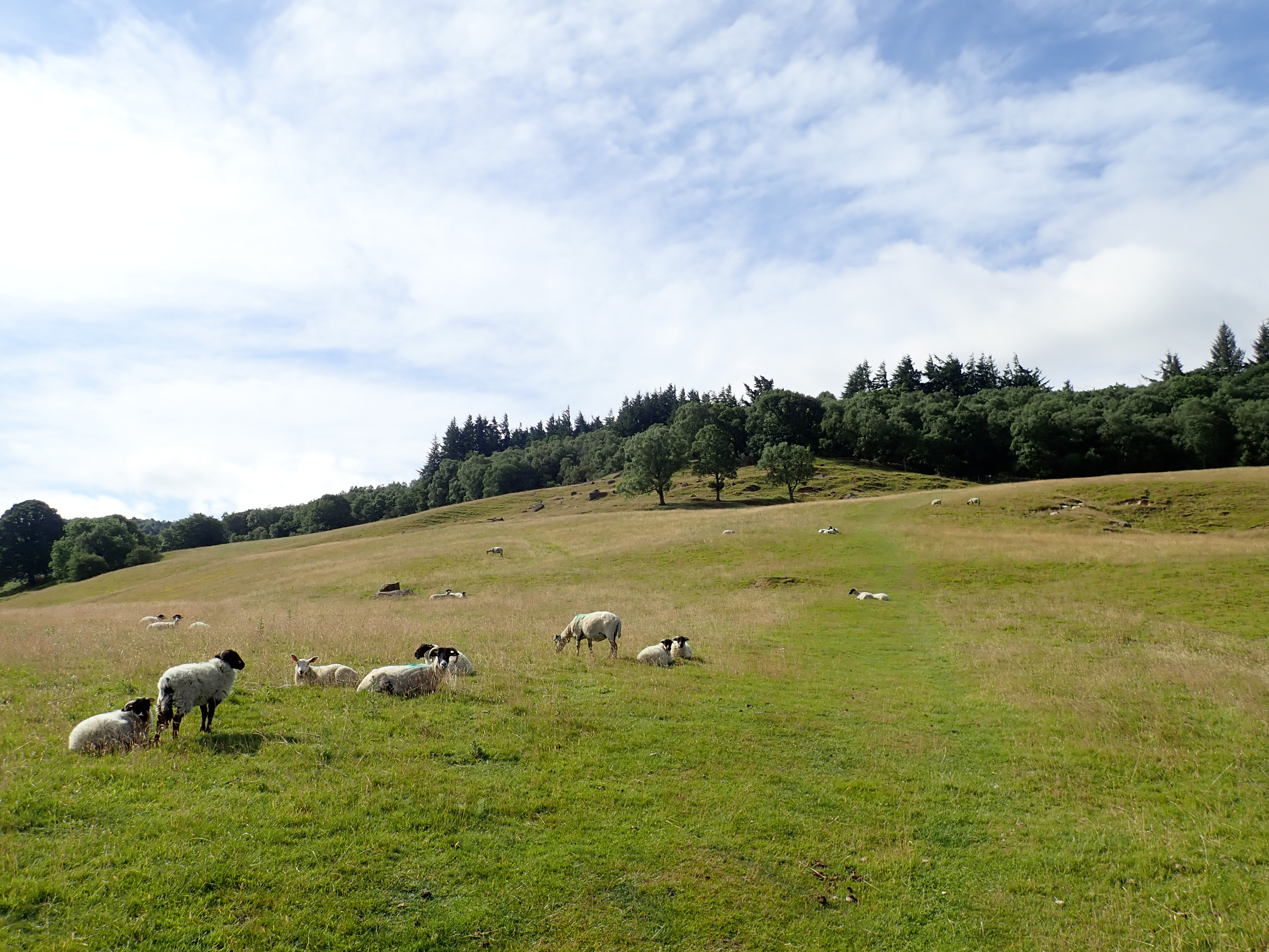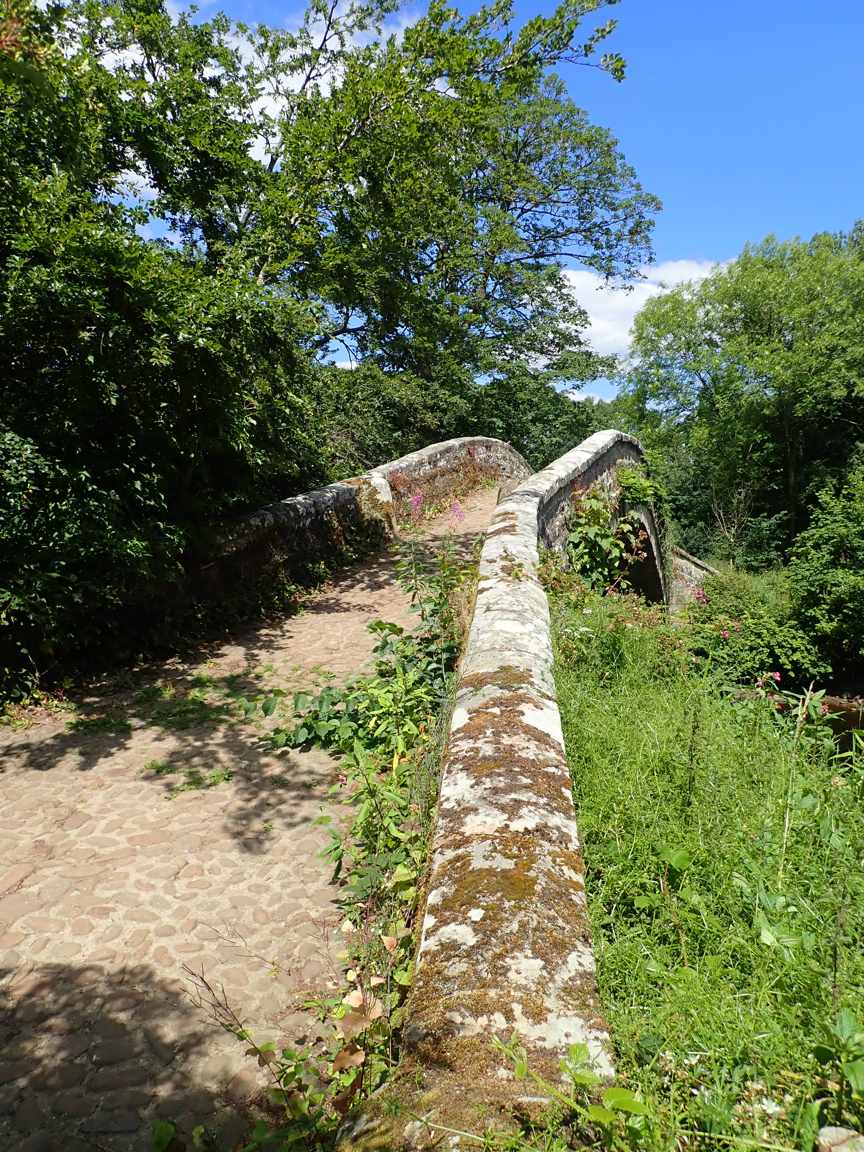 The Nidderdale Way leaves the River Nidd a little way after Darley. It heads uphill through fields and meadows to the woods near Reynard Crag. I followed a narrow stone-flagged path up through the woods to Swarcliffe and to some good views across the dale. My guess is that the Nidderdale Way primarily takes this route up a hill to avoid a long section of walking on a busy road, because from Swarcliffe the Nidderdale Way simply goes back down to the river. It gets there by taking the access track to Bell House, and then skirting its gated entrance to head down a narrow path between a wall and the trees of Wilson’s Plantation. This must be one of the most unpleasant footpaths I have ever walked. It was overgrown with nettles, brambles, holly, and bracken, was swarming with flies, and smelt like something had died. I was relieved to leave it behind to go across a field and, after a little bit of road walking, head down a track to the river.