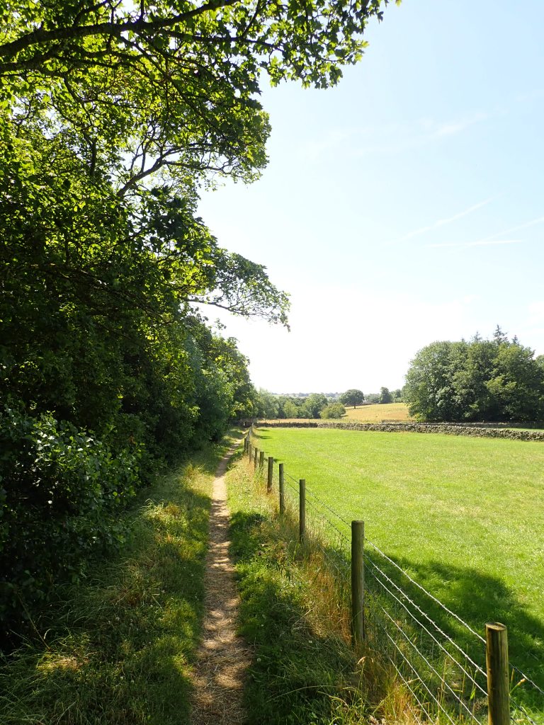 On the other side of the road from Nidd Valley Sawmills is a slot in a stone wall. I squeezed through this and a down a flight of steps; then past a bowling green, tennis courts and a playground to pick up a narrow path running along the bank of the Nidd. The next two miles (a bit over 3km) were a lovely walk with the tree-lined Nidd on my left and fields (and the occasional house) on my right.