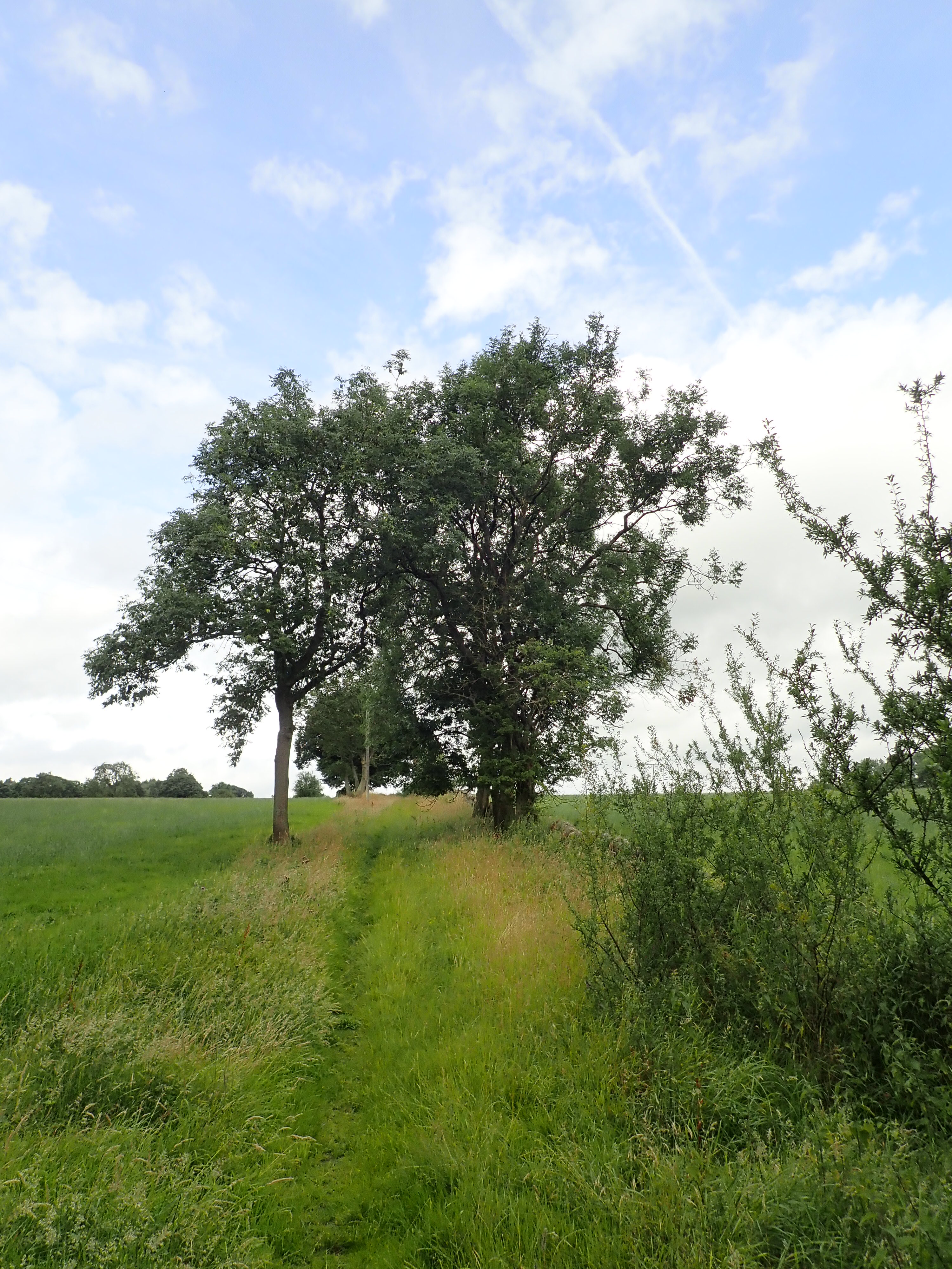 From Shaw Mills, the Nidderdale Way takes a somewhat zig-zag route through farmland along the valley of Thornton Beck, including crossing the Beck three times. It starts by going along a farm access road and through a farm. It then passes through attractive meadows and pastures, briefly into and out of a small wood, and by a corn field. Unfortunately, most of the rest of the way through this valley is a mundane walk along country lanes.