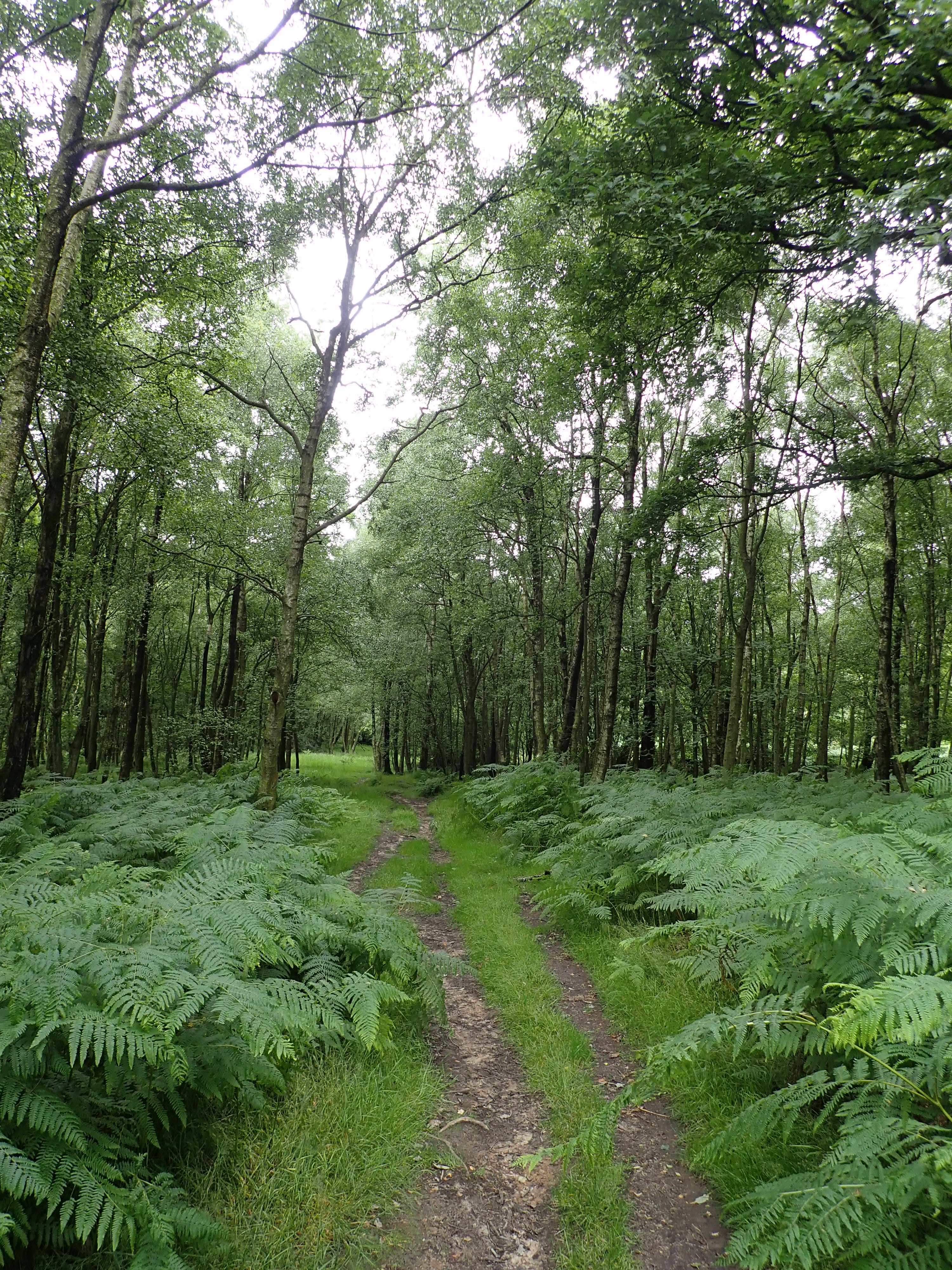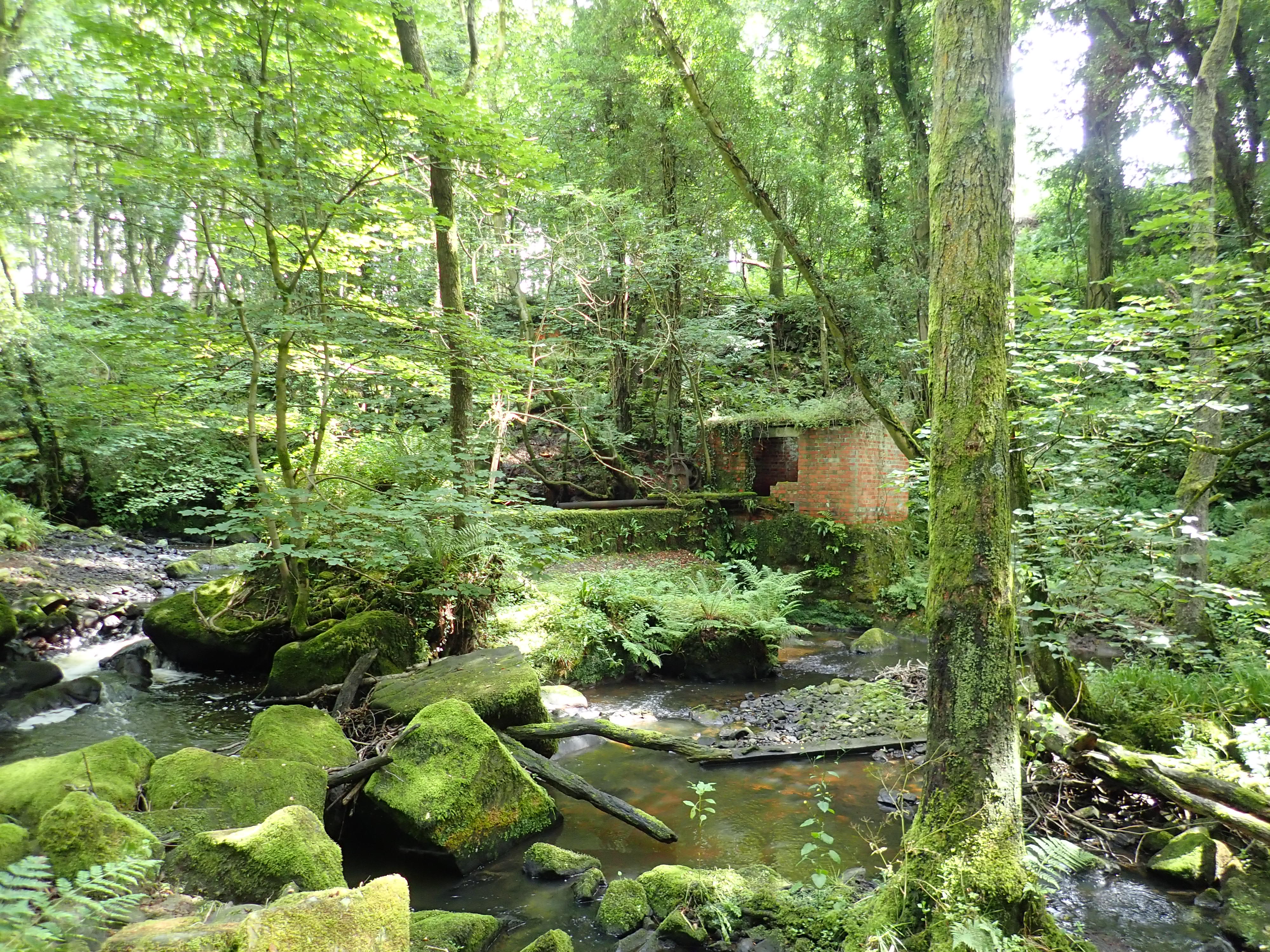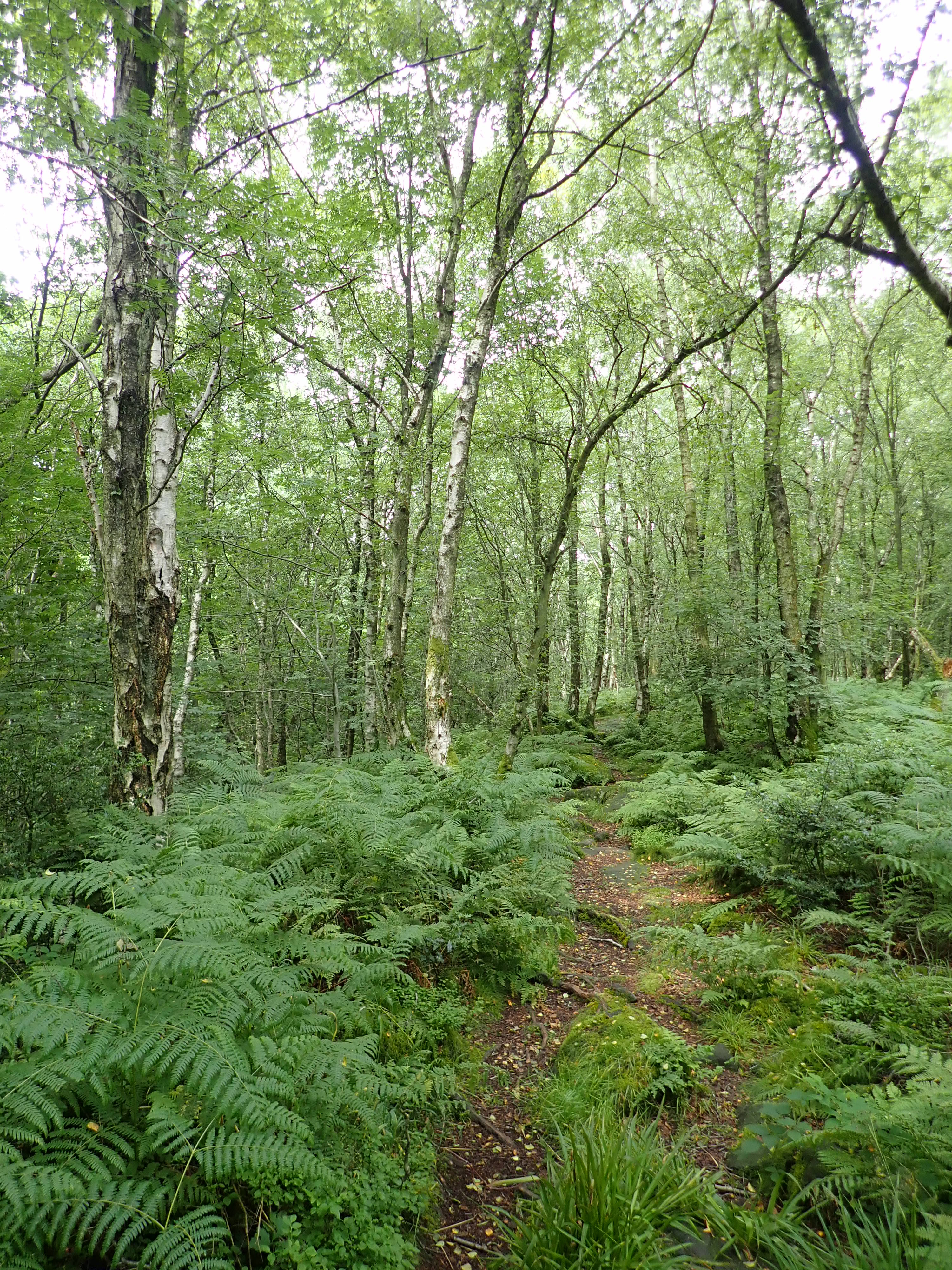 The narrow path followed the beck, passed the remnants of a dam, and then crossed a bridge. There were what looked like the remains of a mill on this bank, and a switchback took me past orange brick buildings swallowed by nature and decayed by time. This was followed by a lovely walk through a wood of Silver Birch. However, after passing an overgrown paddock, the woods changed to become more Brothers Grimm in character. The woods were dense, there was less light, and the trees were more twisted. The guidebook warned me that the path would become faint and not to head downhill, yet I headed downhill on a path that seemed clear before realising my error when the path became indistinct. I worked my way through the trees to pick up a clearer path next to a wall. I then arrived at a T-junction that wasn’t on my map or in the guidebook, and where there was no sign of the fingerpost described in the book. Feeling a bit frustrated, I decided to turn left as the map did show the path going downhill and I knew I was meant to cross the beck soon. A muddy path took me to a sturdy bridge over Fell Beck and a feeling of relief.