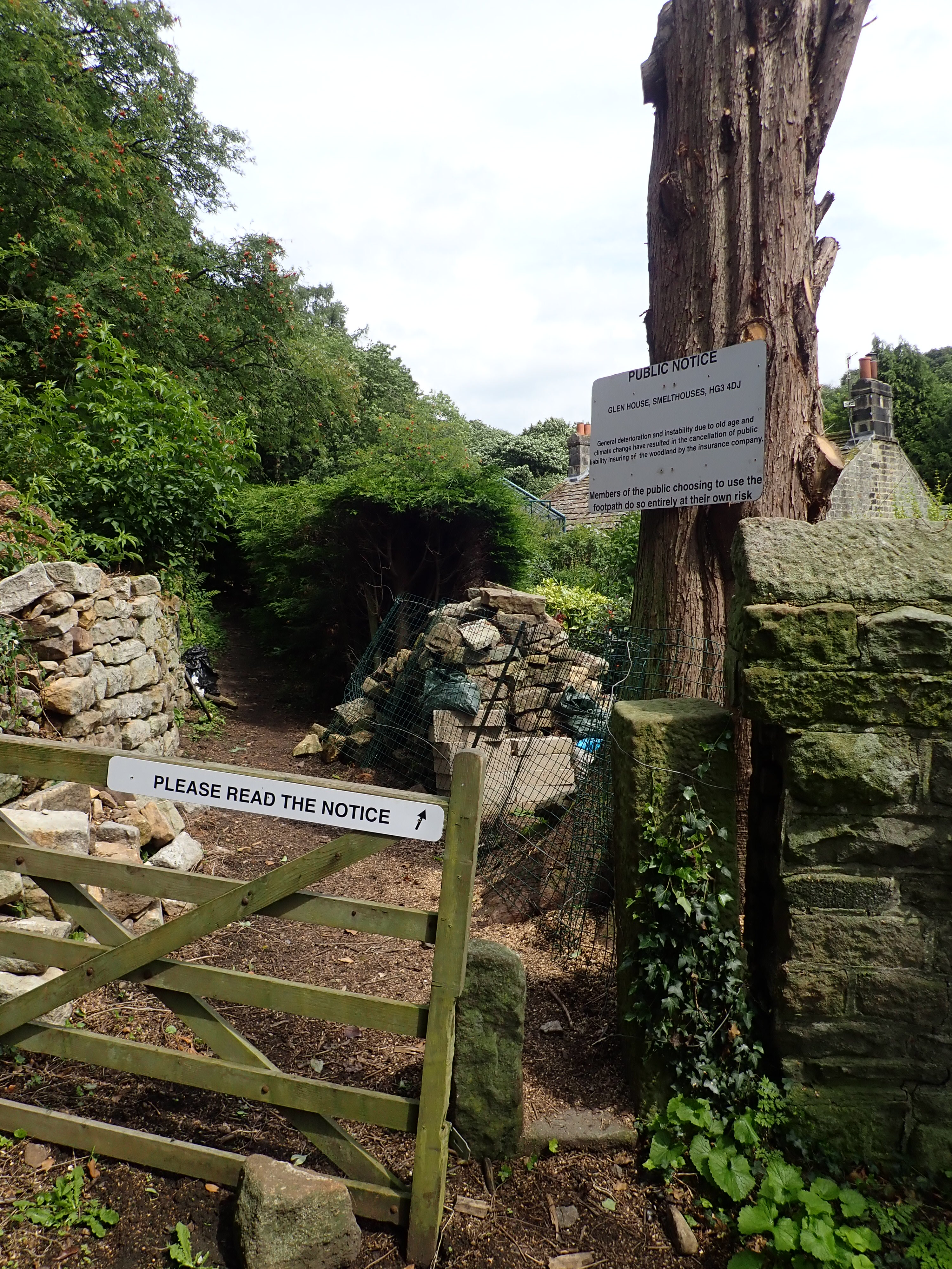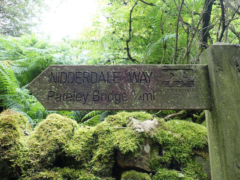 From Brimham Rocks, the Nidderdale Way essentially does a large U-turn. It heads South on a narrow path between trees and a wall, before turning West to go downhill on a path through the pretty High Wood. This led me to Smelthouses, which gets its name from the 15th century smelt mill built here by the monks of Fountains Abbey. It’s a hamlet of lovely cottages that sits on both sides of Fell Beck. At Smelthouses, the Nidderdale Way turns abruptly to go North to follow Fell Beck upstream through a wooded valley. The start of the path through this valley is a bit strange. It’s marked with a series of warning signs that made me watchful for dangers in the woods. It also runs between the garden of a magnificent cottage with a garden containing a large pond, and a huge stone wall. My guess is that the cottage was once a mill that was cut out of the side of the valley, and the impressive wall was built to stop the valley side sliding into the mill. After I was past these curiosities, the wooded valley was gorgeous, and my favourite part of this section of the Nidderdale Way.