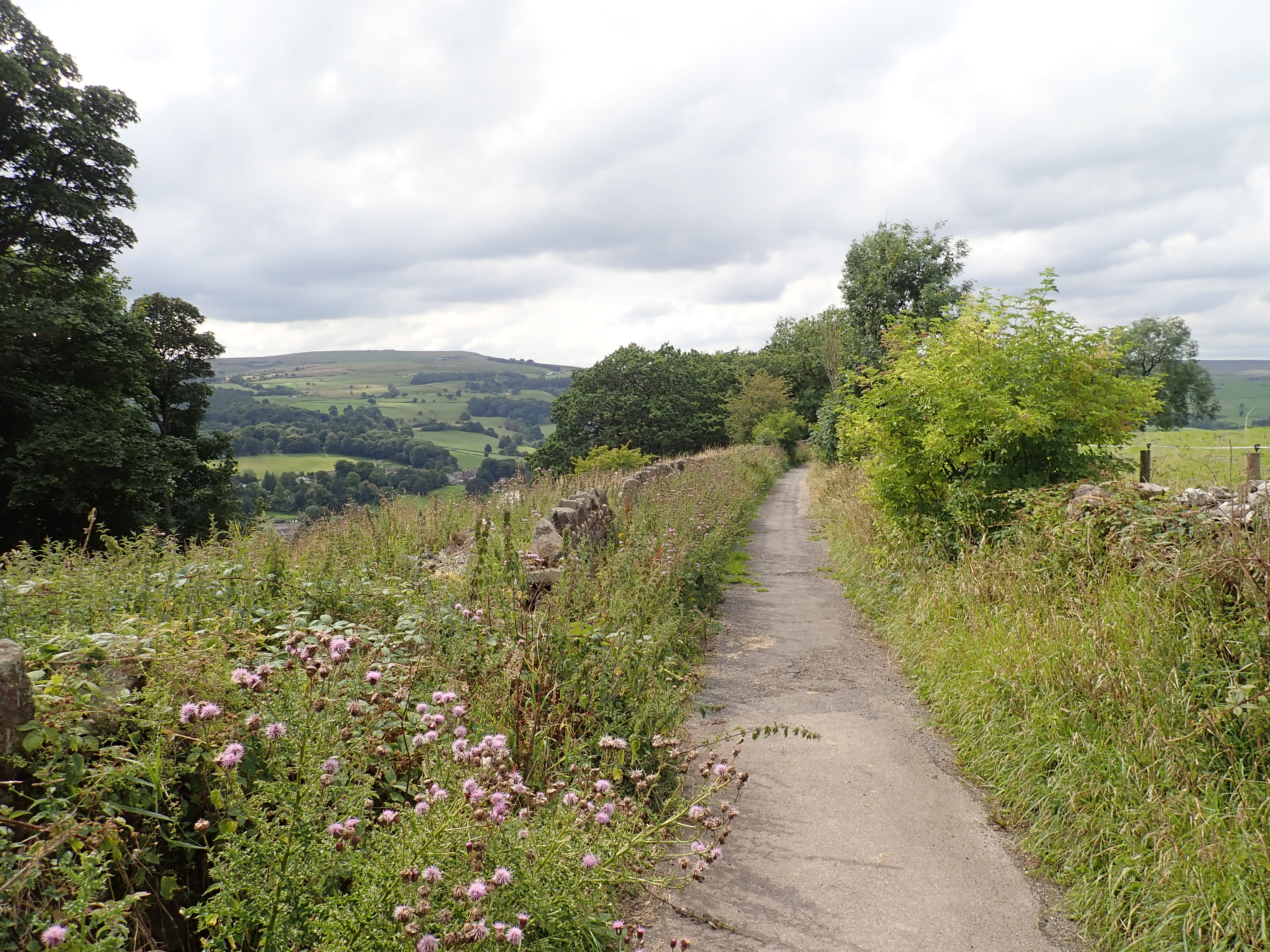 From here, I walked uphill through pastures to arrive at some houses and the start of the last part of the Nidderdale Way. This part traverses the side of the dale by paths, tracks, and some sections of road. It has great views of Guisecliff, where I was on stage four of the walk, and across the dale. I passed attractive cottages and a llama trekking centre, before arriving at one end of the Panorama Walk.