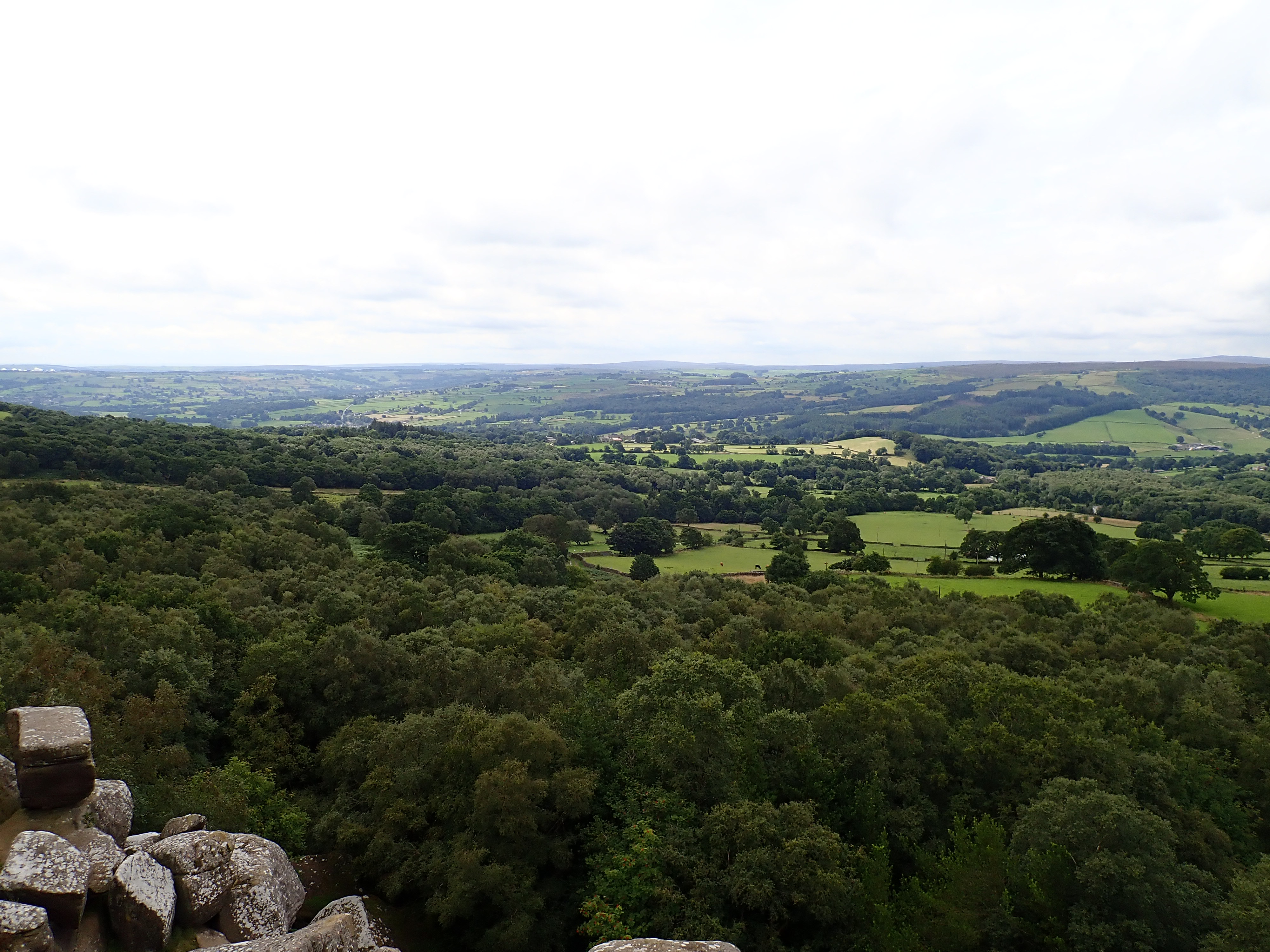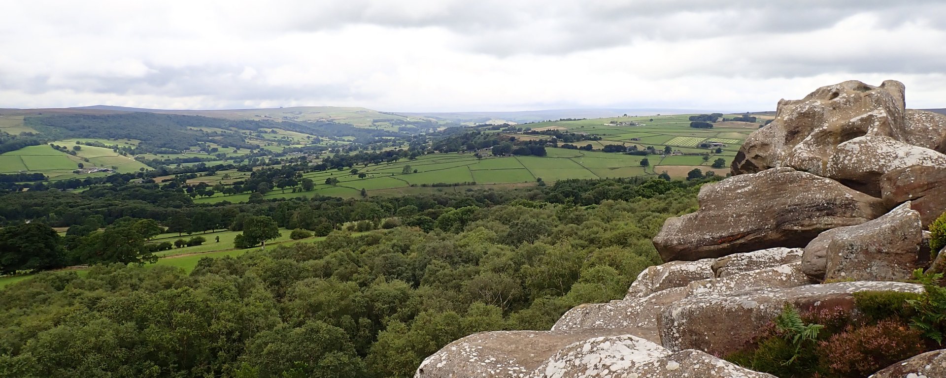 Lower Nidderdale from Brimham Rocks. Guisecliff and Heyshaw Moor are on the other side of the dale on the right. Dacre Banks is partly visible beyond the woods (look for a road heading away from the camera). Menwith Hill is in the far distance on the left.
