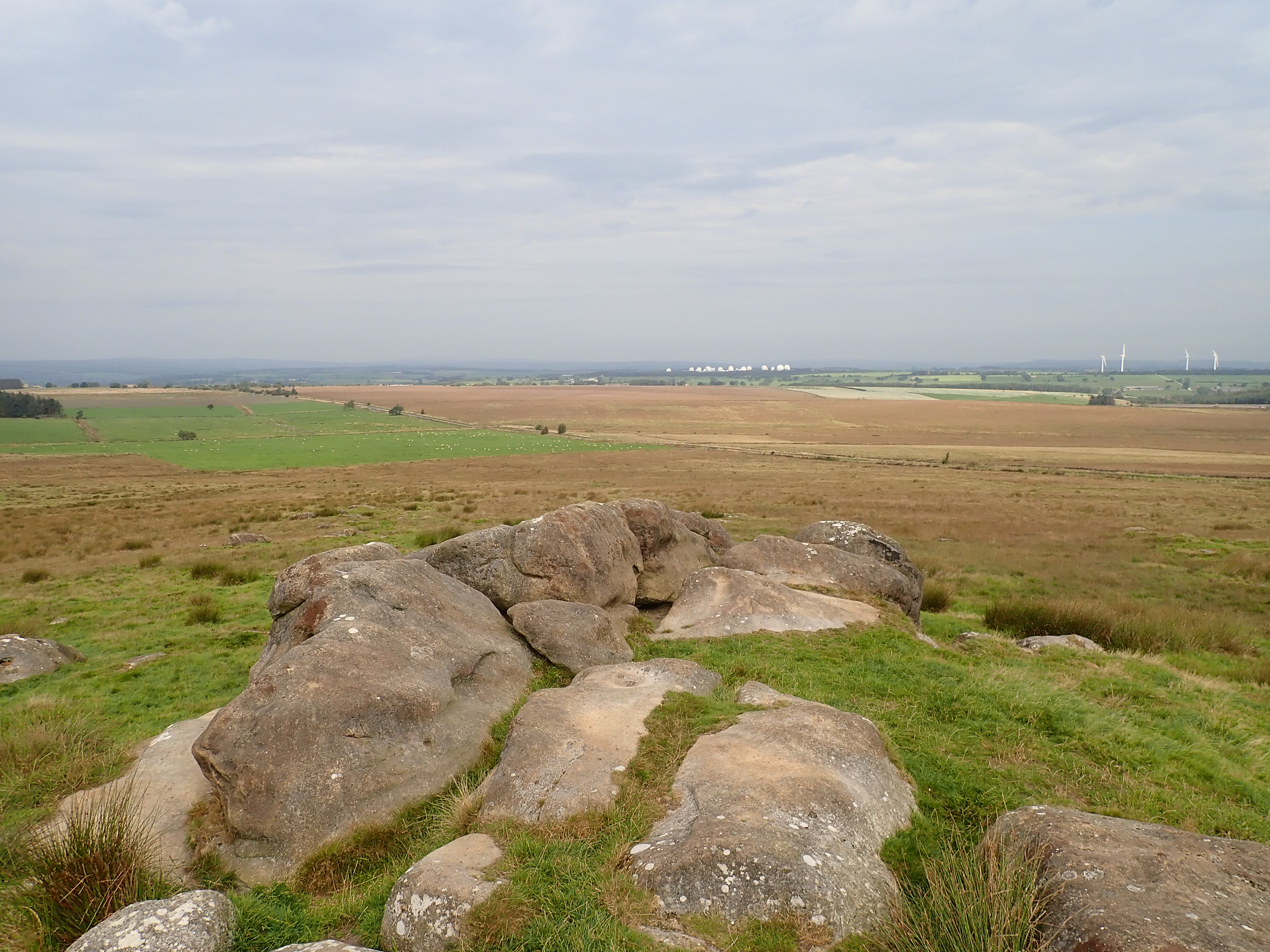 The view of the edge of the Yorkshire Dales, Menwith Hill military base, and the Knabs Ridge wind farm from Little Almscliff.