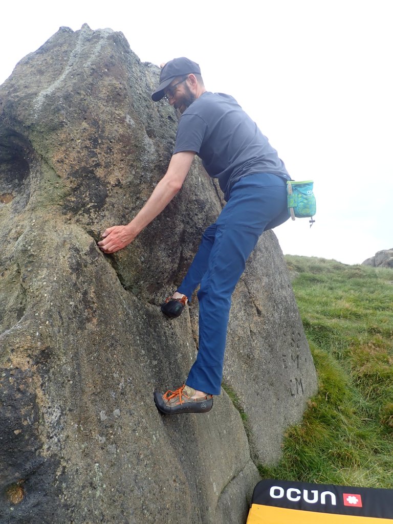 Visiting Little Almscliff was a relaxing and quiet way to spend a Sunday morning. I could climb on some easier problems, my son could clamber about on the rocks, and my wife could sit and read (as well as take climbing photos – thank you). It was a warm and humid day, but at Little Almscliff a gentle breeze made it feel pleasant. We also had Little Almscliff to ourselves, apart from a couple of people passing by as they walked their dogs.