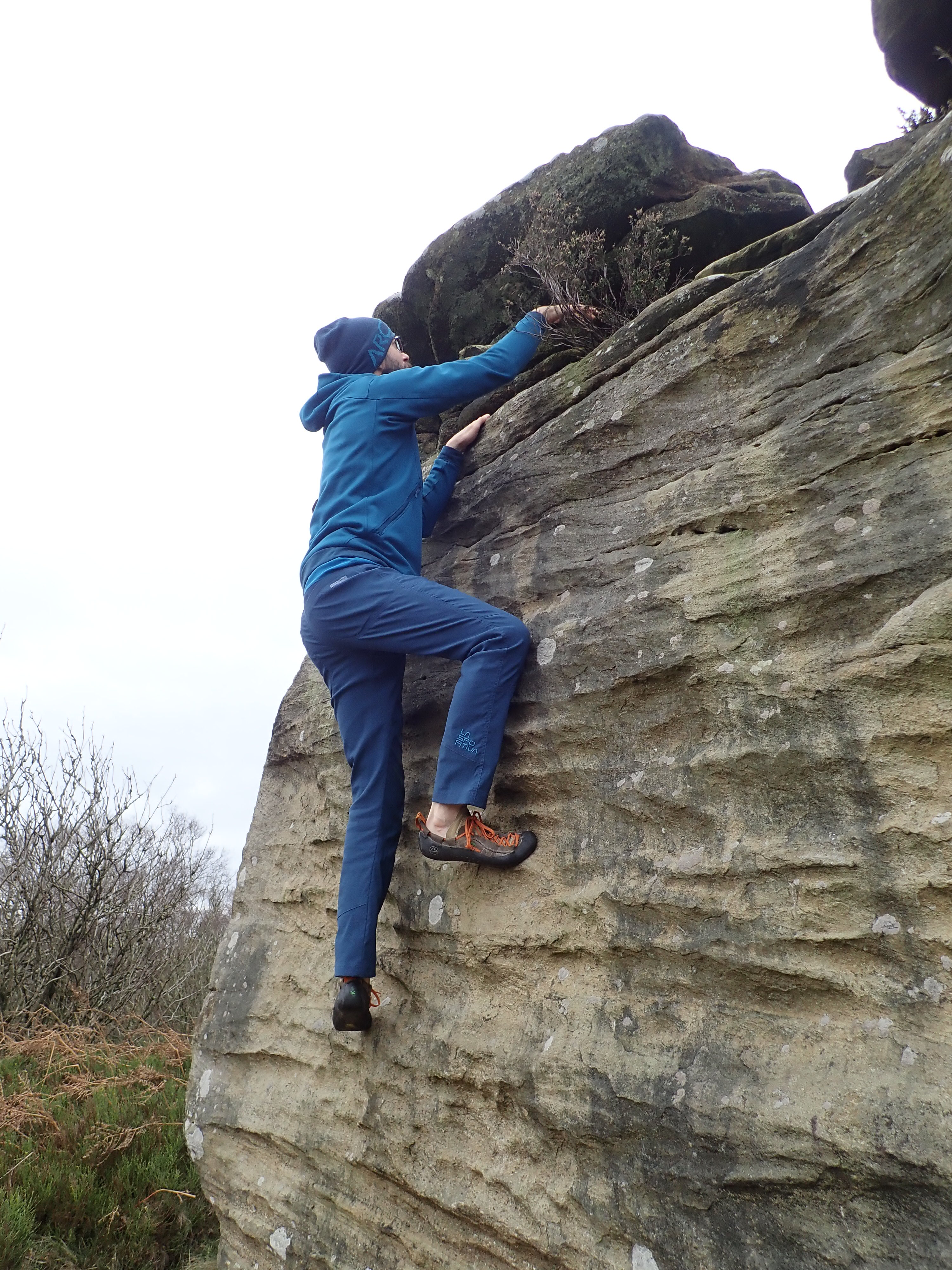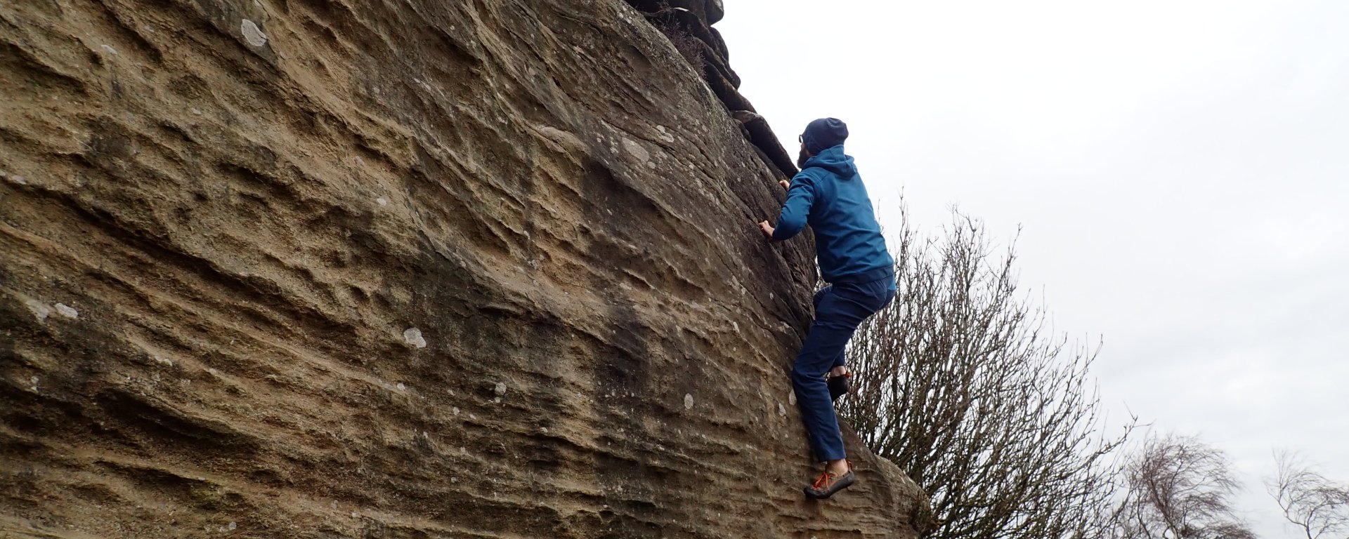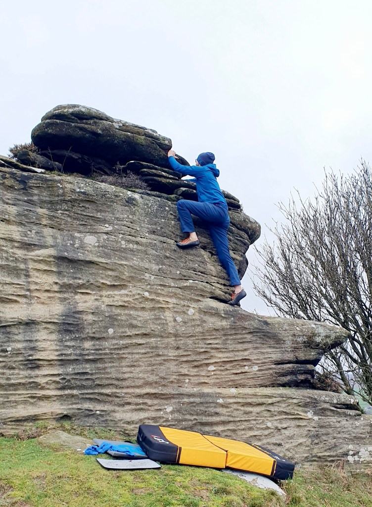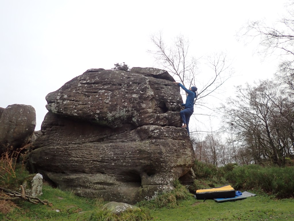 Me climbing Ripples from a Stone (4+) in the Pinky sector at Brimham Rocks.