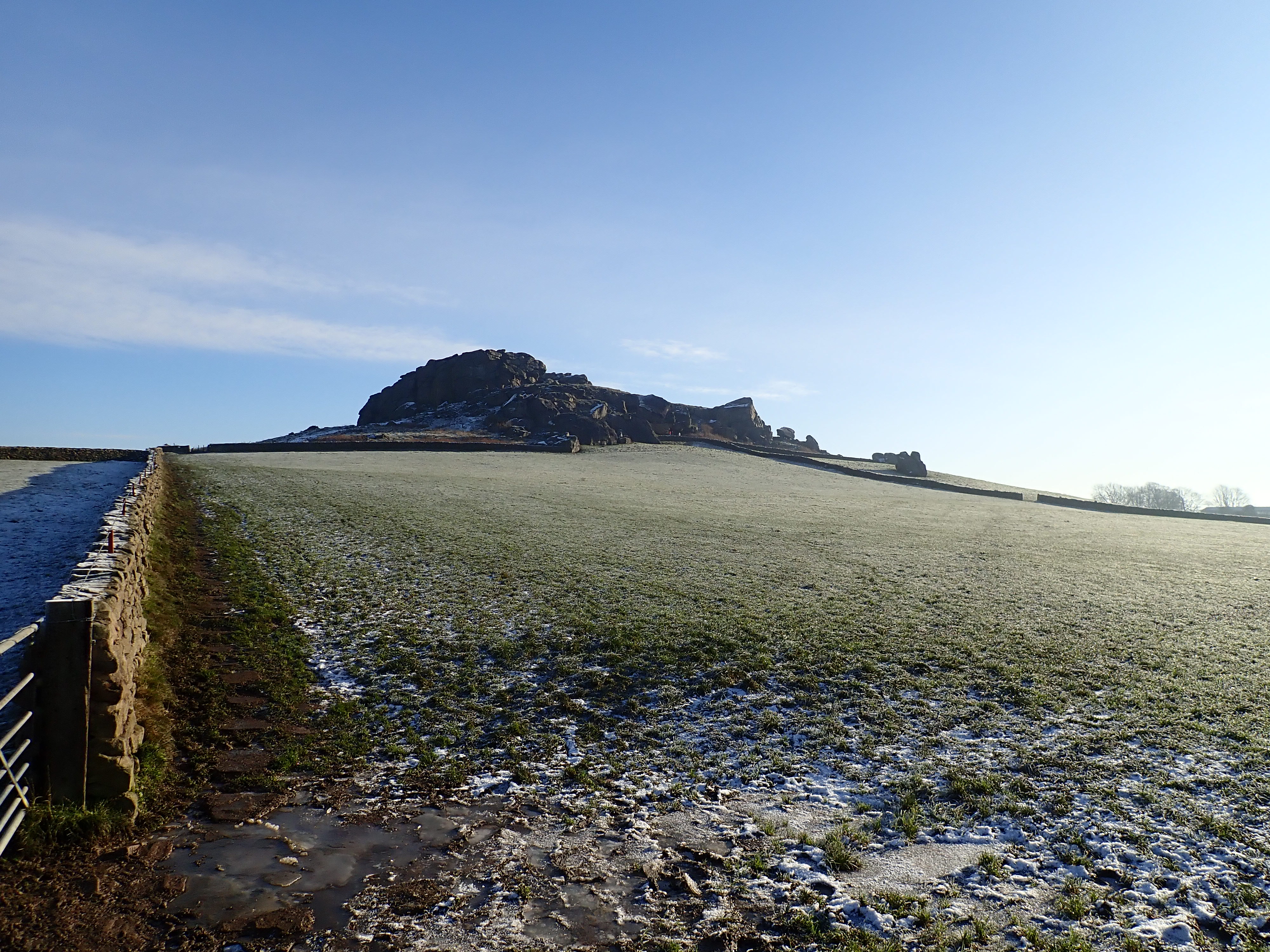 I could hear ice cracking under the weight of my car as I pulled into the lay-by within sight of Almscliff. The waterlogged mud of the layby had turned into a dark brown ice-skating rink, and I cautiously moved around my car as I got my bouldering pads and bag together. In some ways, I was pleased about this perilous ice. The field that leads up to the Almscliff has a reputation for being muddy. In the past, inconsiderate climbers have attempted to sidestep the mud by walking along the top of the drystone wall that runs up the hill. This caused damage to the wall and required it to be regularly repaired. BMC responded to this situation by laying stepping stones up the edge of the field. The farmer who owns the land responded by adding concrete and barbed wire to the top of the wall. But on Saturday, the mud and puddles were frozen solid. I admired the view of Almscliff in golden light, and then walked over the creaking ice and up the hardened field.