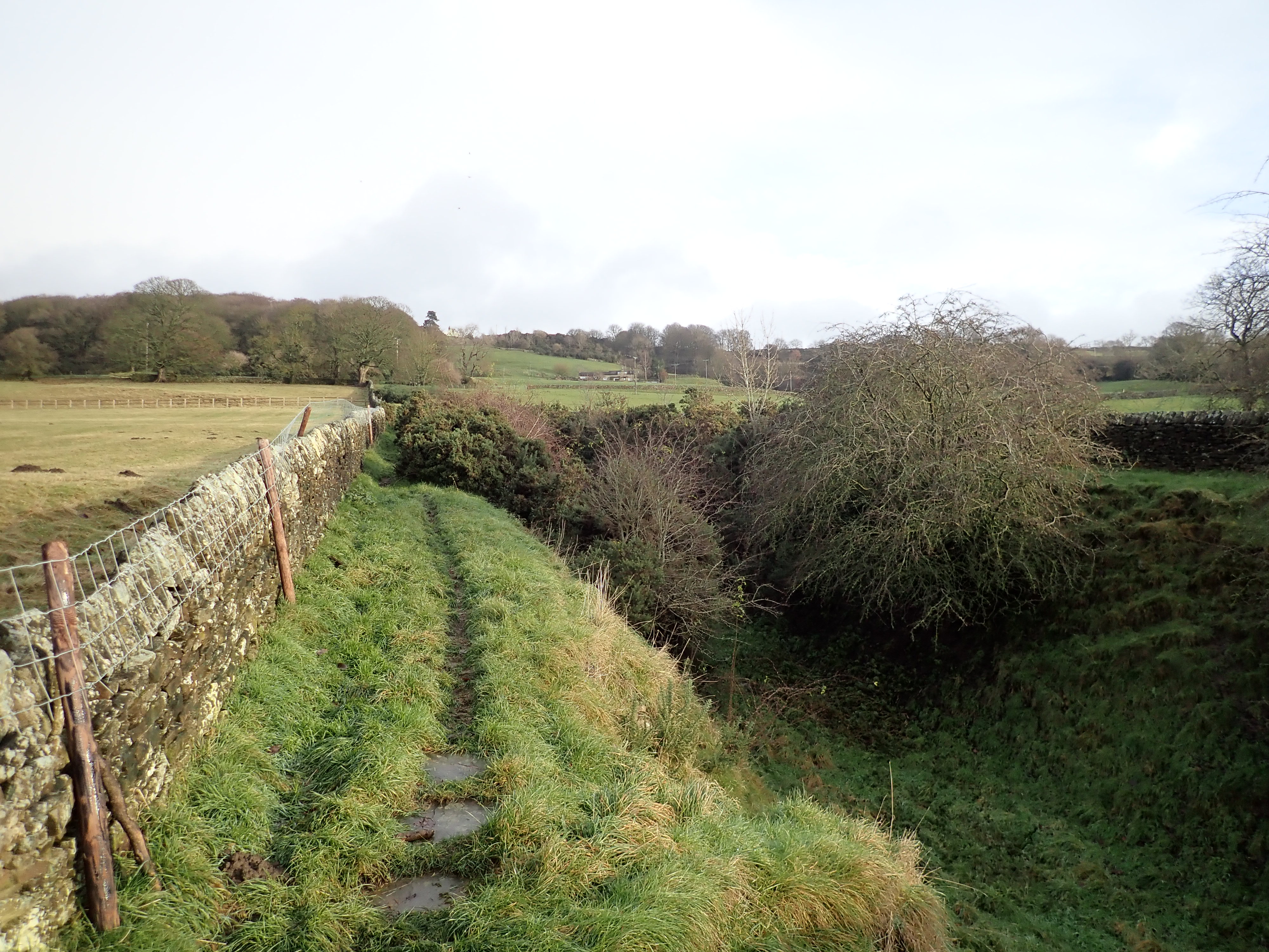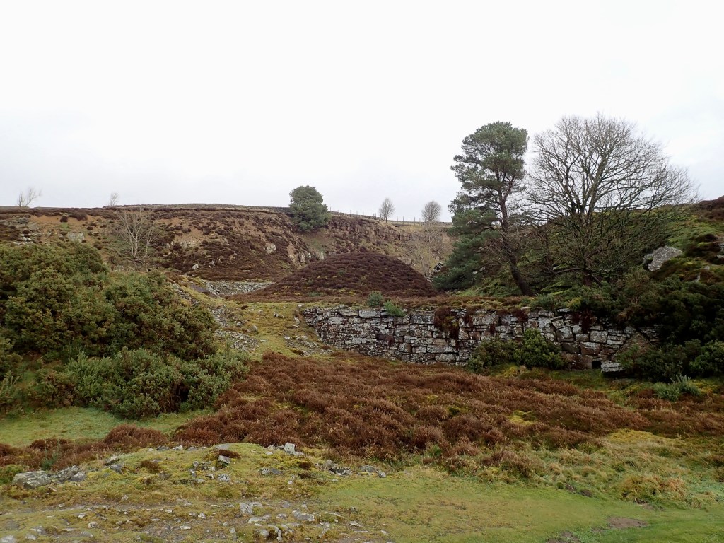 A little way back from the incline were the ruins of the tramway’s wheelhouse. Unfortunately, all that was left were a few sections of broken stone wall and rusted metal poles. Around this, the quarrying had taken large chunks out of the hill to form an area of flat ground and, behind this, broken steps and corners of rock and earth. Around the quarry’s downhill edge was a field of overgrown spoil heaps. We followed an interesting path through and over these mounds, with the broken-up land of the quarry on our right, and lovely views over Nidderdale on our left. After a few minutes, we left the quarry to cross a couple of fields and go onto Wath Lane.