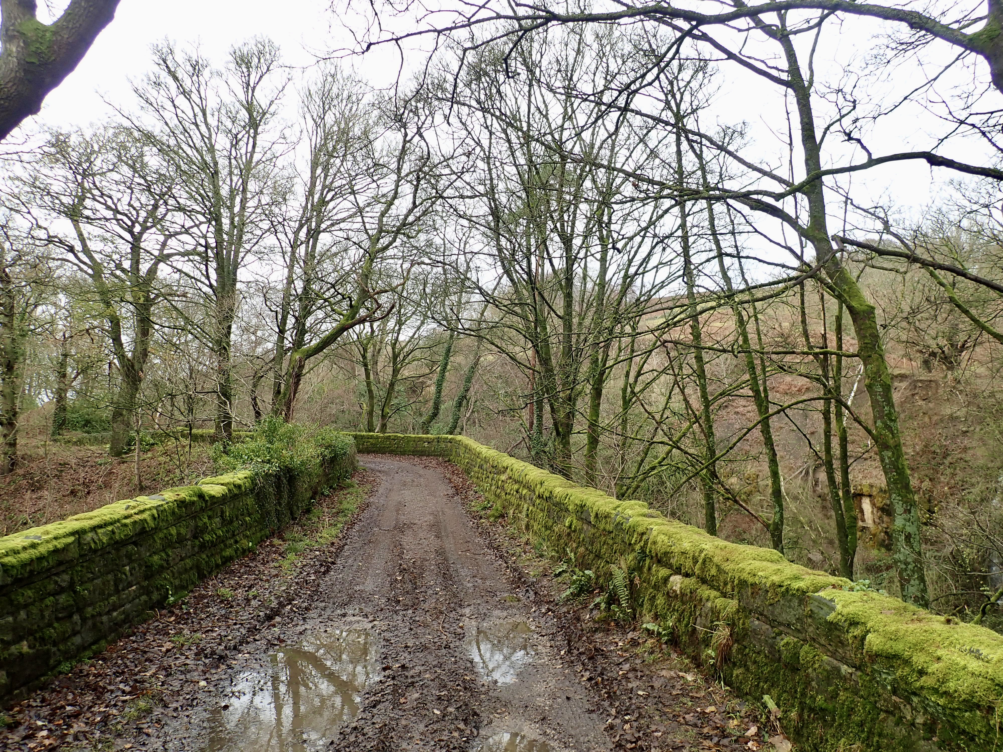Just beyond the farm we went by the remains of Wood Top Quarry. This quarry was a source of stone used in the building of Gouthwaite Reservoir less than half a kilometre away as the crow flies. The extraction of this stone left a giant hole in the hill that is full of water and split by a ravine on the downhill side. A waterfall tumbling down one corner of the quarry feeds this large pond, and this is in turn fed by springs on the moor above. The trees that surround this hole were bare of leaves, but green with ivy, moss, and lichen. The track went over the ravine by an impressive, curved stone bridge that I guessed might have been connected with the building of the reservoir.
