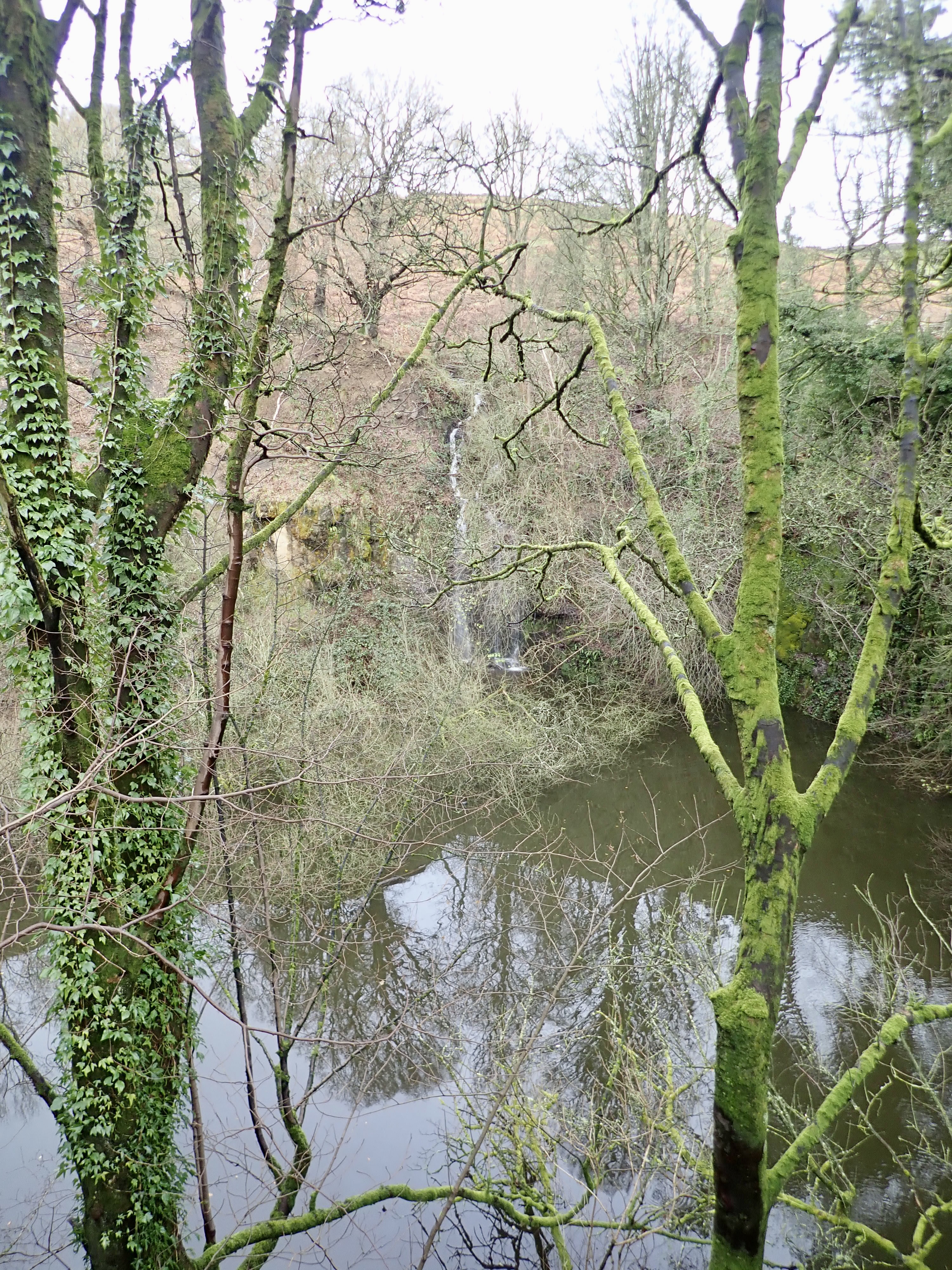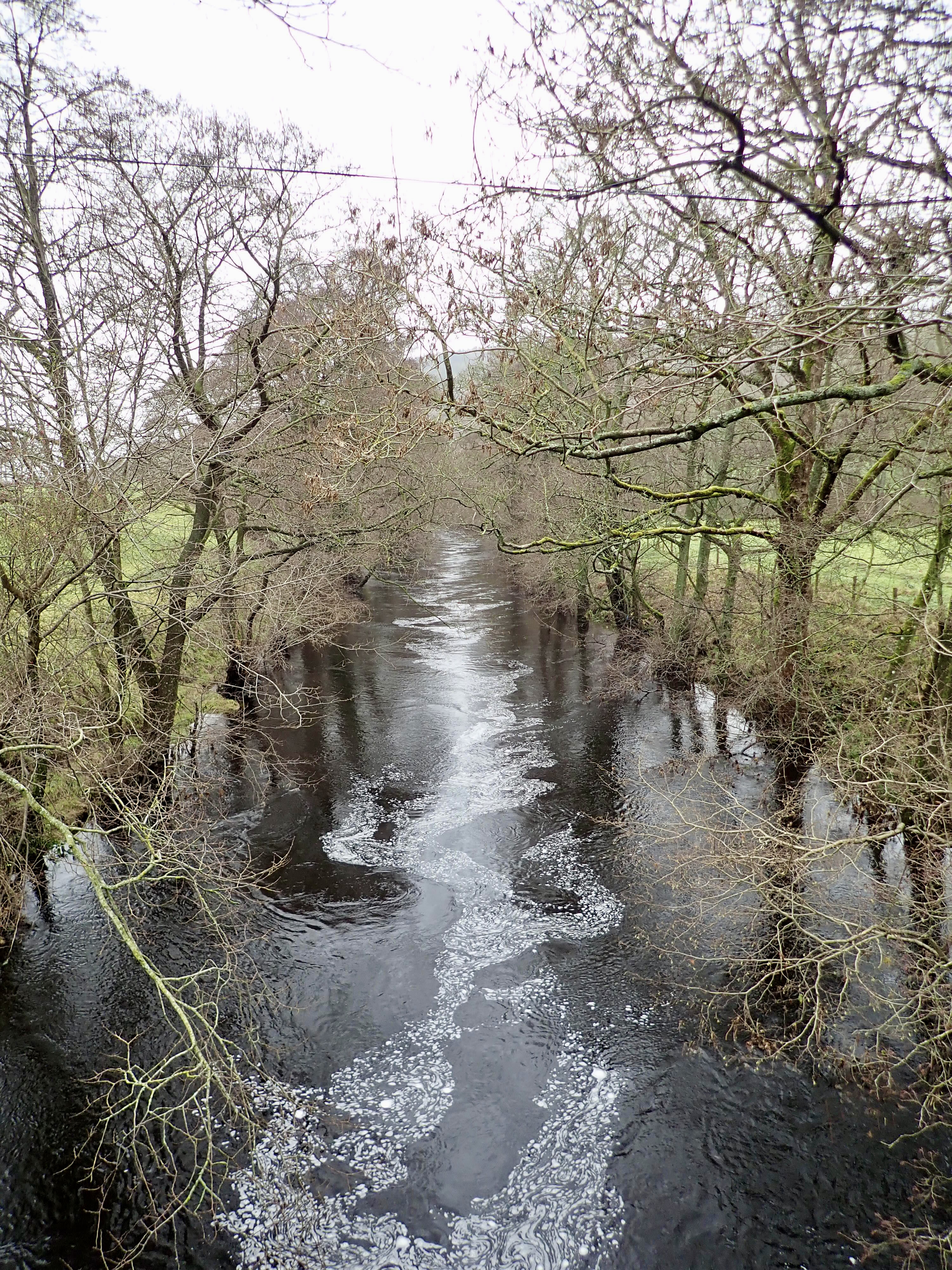 We then squelched through meadows until we reached Wath Bridge. I took a little detour to the rise of the bridge to look at the swollen Nidd and was delighted to see a kingfisher dart along the river. The kingfisher landed on a branch, and Valerie joined me to look at it. We both also watched the strange shapes made by a white, soapy substance as it seemed to dance down the centre of the Nidd. Although I guessed that this was probably some sort of pollution, and so wished it wasn’t in the river, I thought that how it was behaving in the water looked beautiful.
