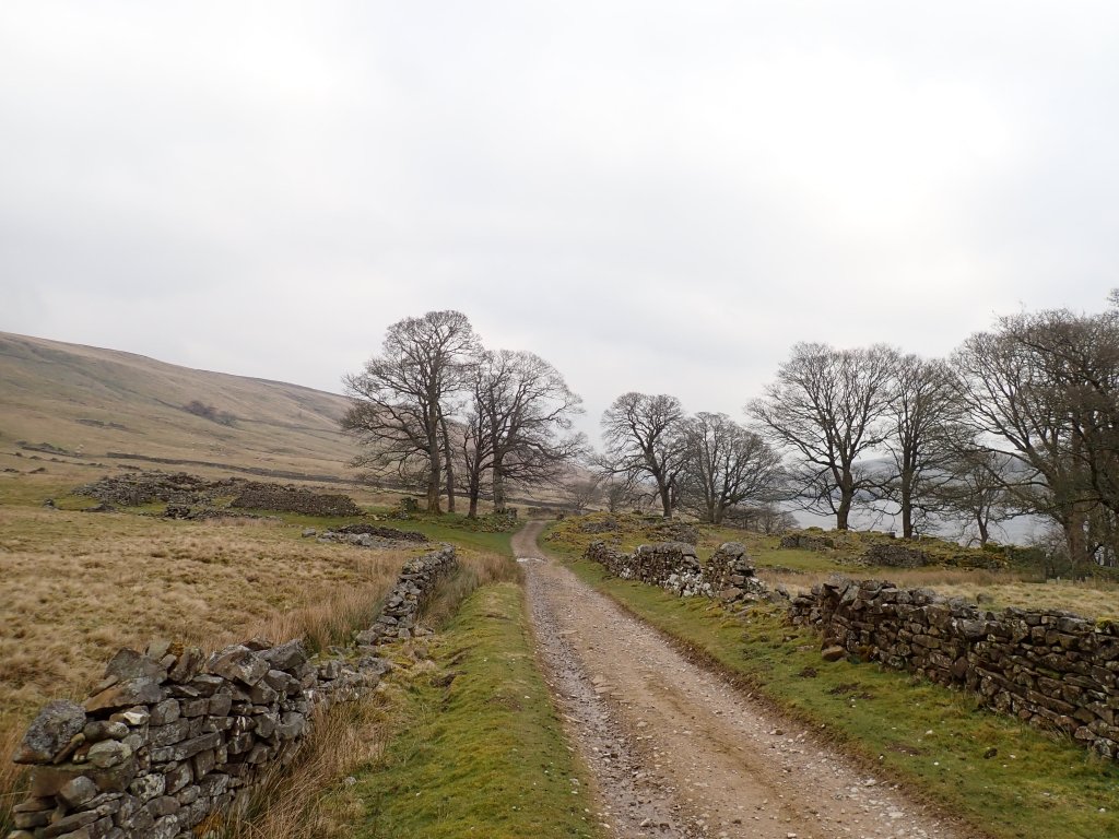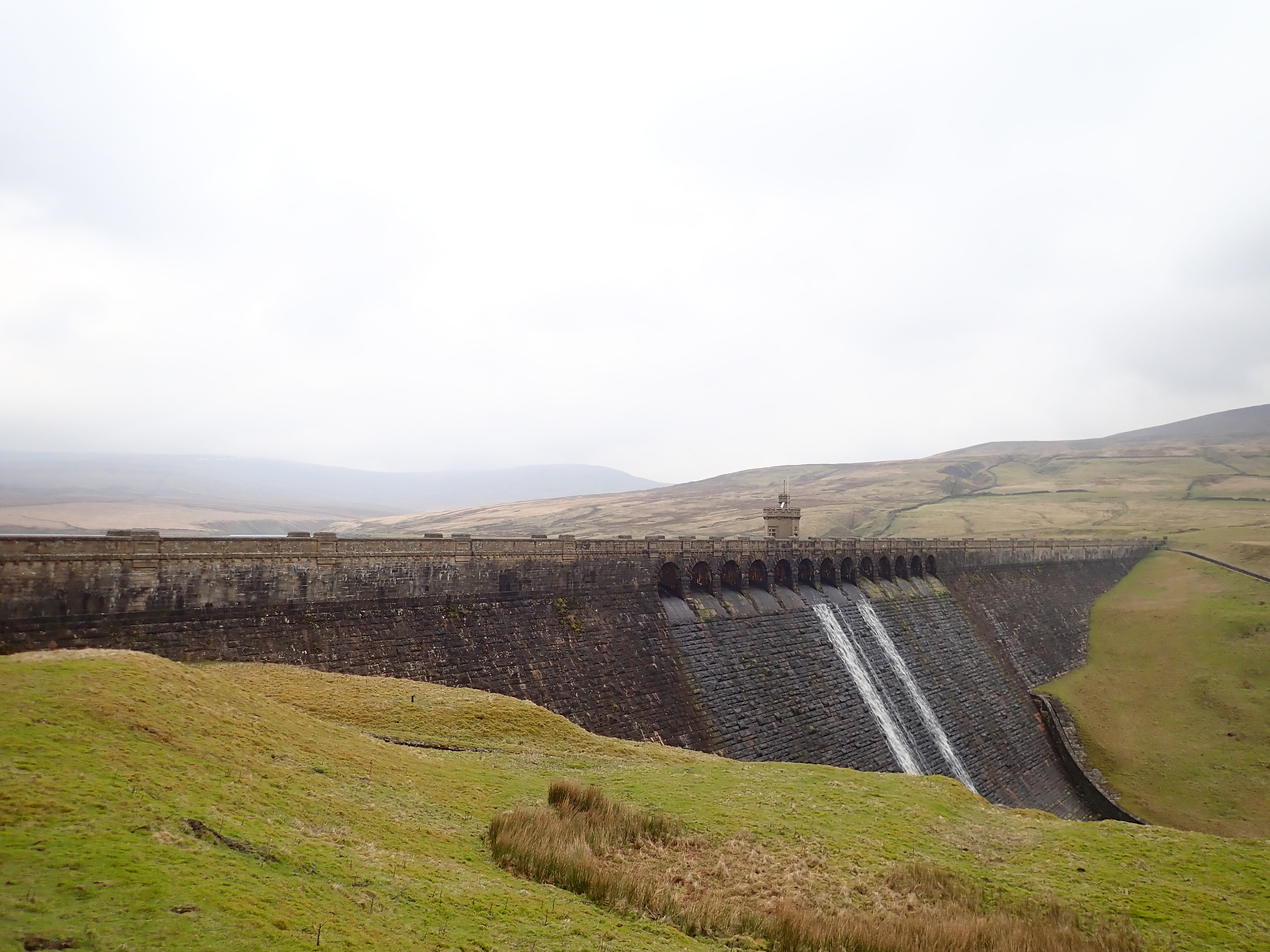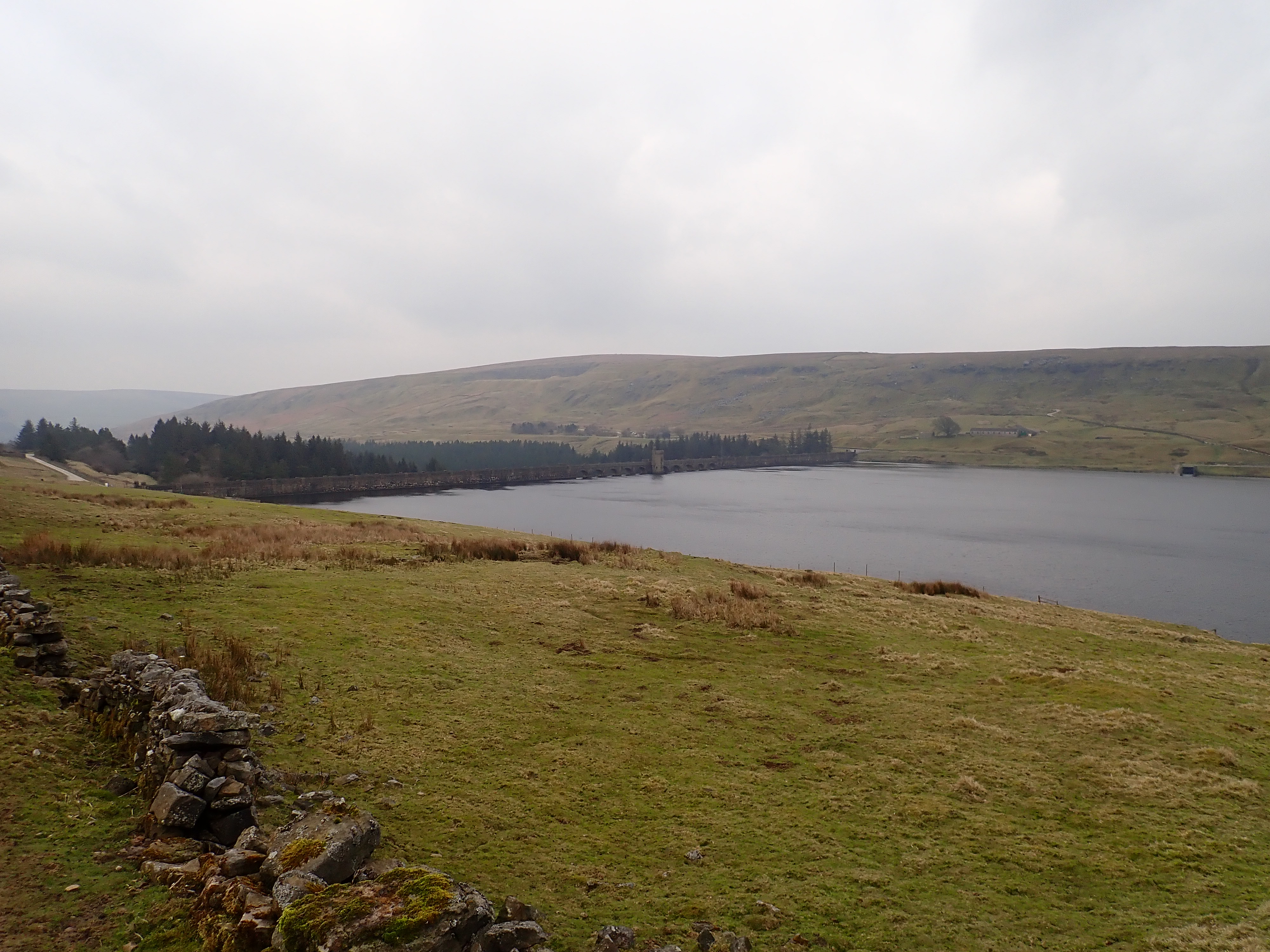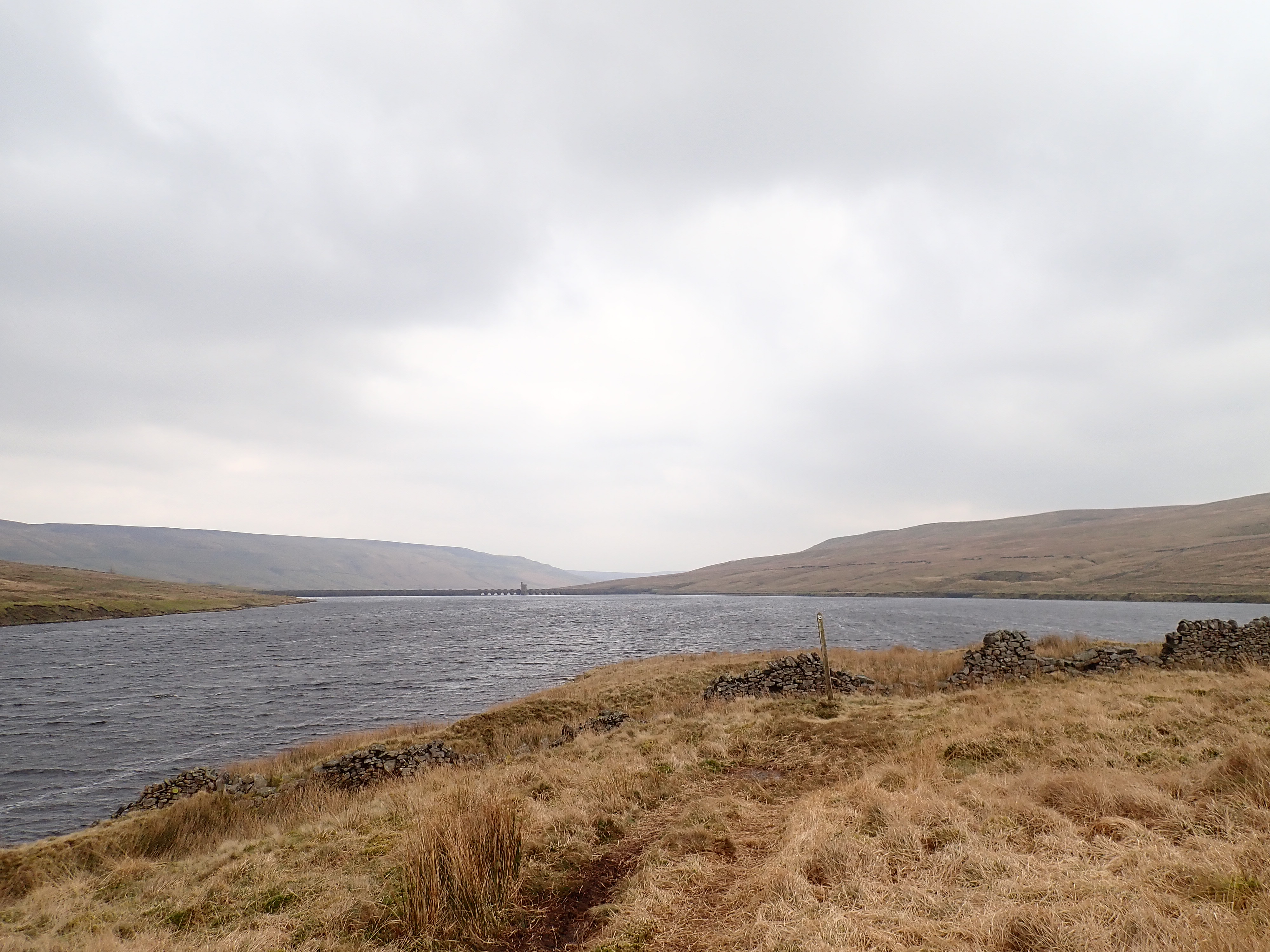 Across the dale was an isolated, lonely grove of trees that marked the site of Lodge, and I tried unsuccessfully to spot its remains. As the track curved to the left, the reservoir narrowed and the sides of the dale next to it steepened. The dark stone walls of Angram Dam came more and more into view as I continued along the track. Great Whernside sat in the distance behind the dam, with some patches of snow visible on its upper slopes. Angram Dam looked faintly ominous with its many blackened stones and in that cold, washed-out weather.