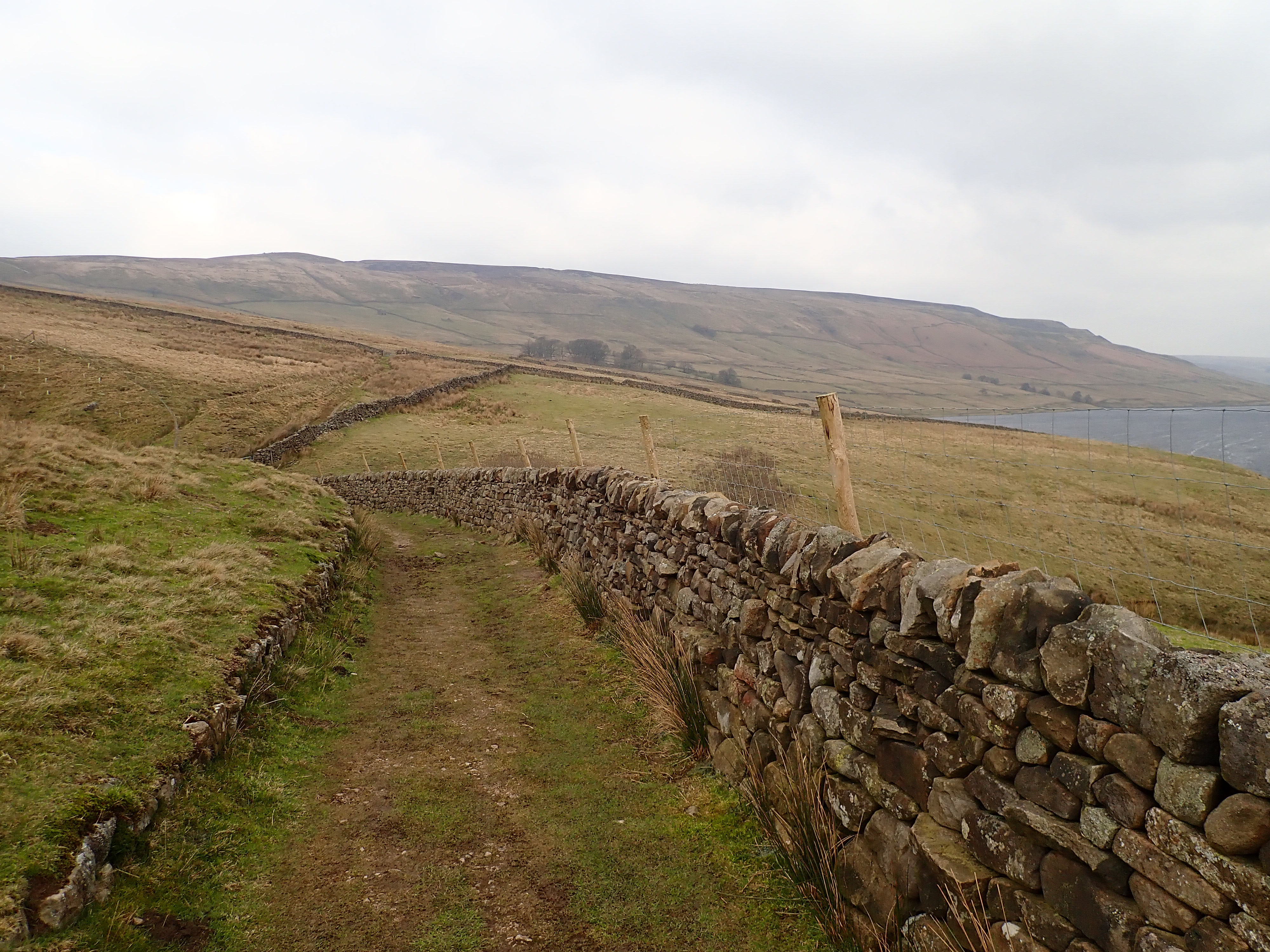 This track initially ran between the reservoir and a substantial stone-lined trench. This was one of two channels that run on each side of Angram Reservoir, and which were used to bypass the reservoir and maintain the level of the River Nidd during the construction of the reservoirs. These became obsolete once Scar House Reservoir was finished.