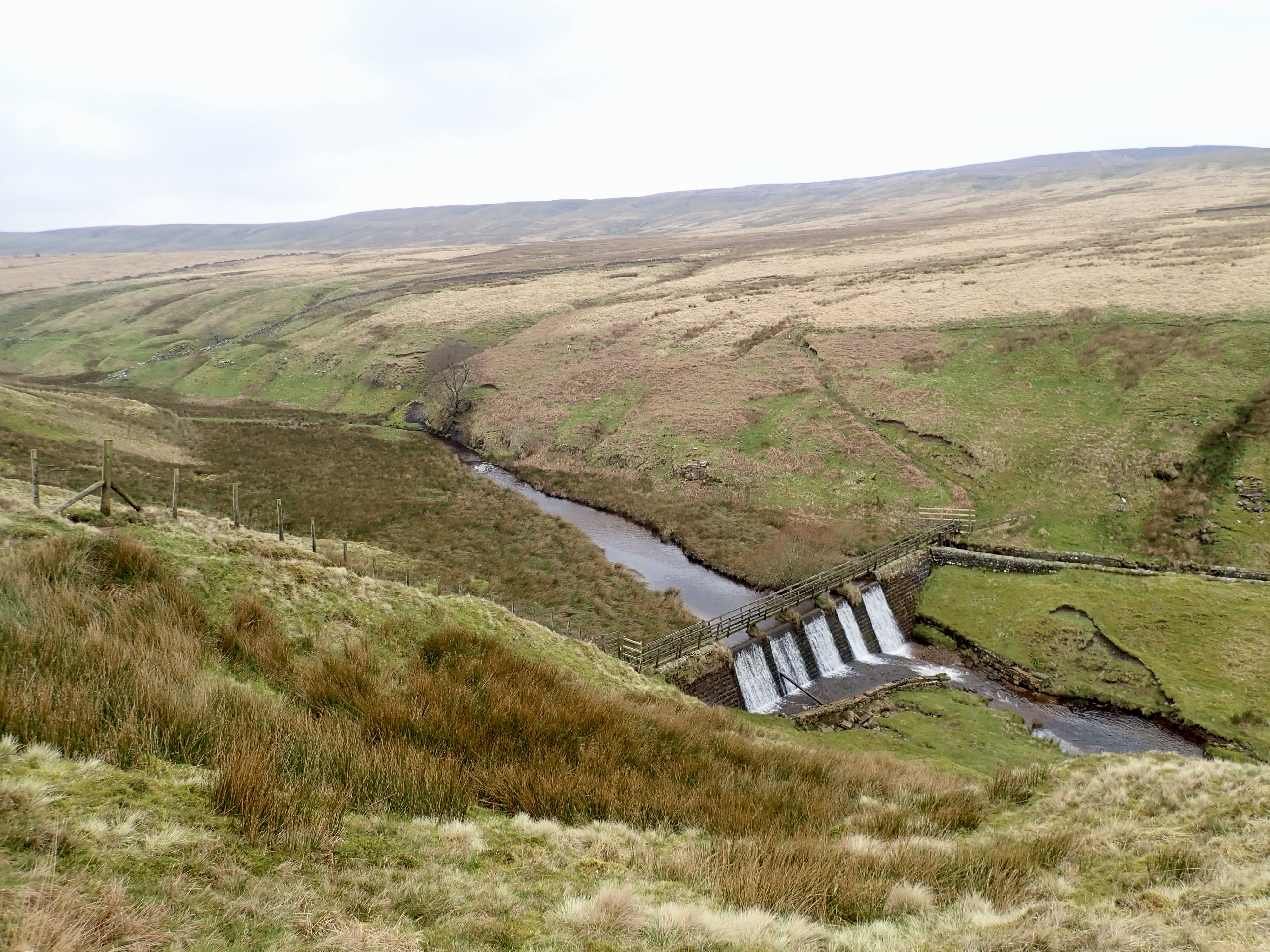 The path stayed high above the water until the inlet came to its narrowest point. It then dropped steeply down to the weir over which flowed the infant River Nidd. A wooden bridge ran across the top of the weir. I looked up this side valley to where the Nidd disappeared into the distance on the slopes of Great Whernside. I was pleased to have made it here, and headed down to the bridge.