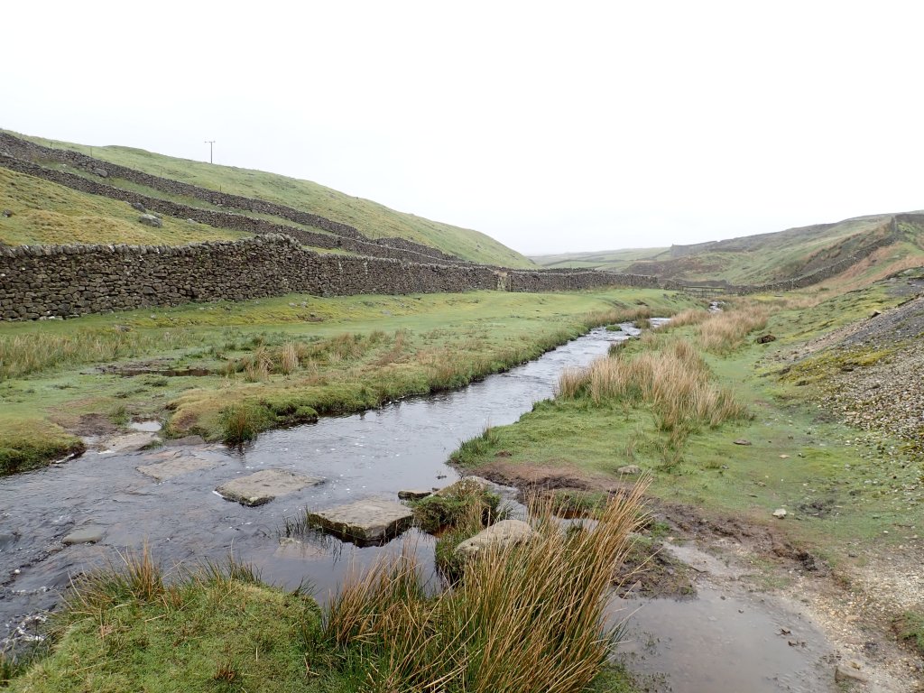 There used to be a mill at Hole Bottom. The remains of this can be seen in a small weir in Hebden Beck and, just beyond the holiday cottages, a series of low walls and stone-paved floors by the river’s bank. I passed these as I headed to a stone bridge, which, like the road running up the valley, had been built by miners to enable access to the workings. I took this route as I carried on up the valley.