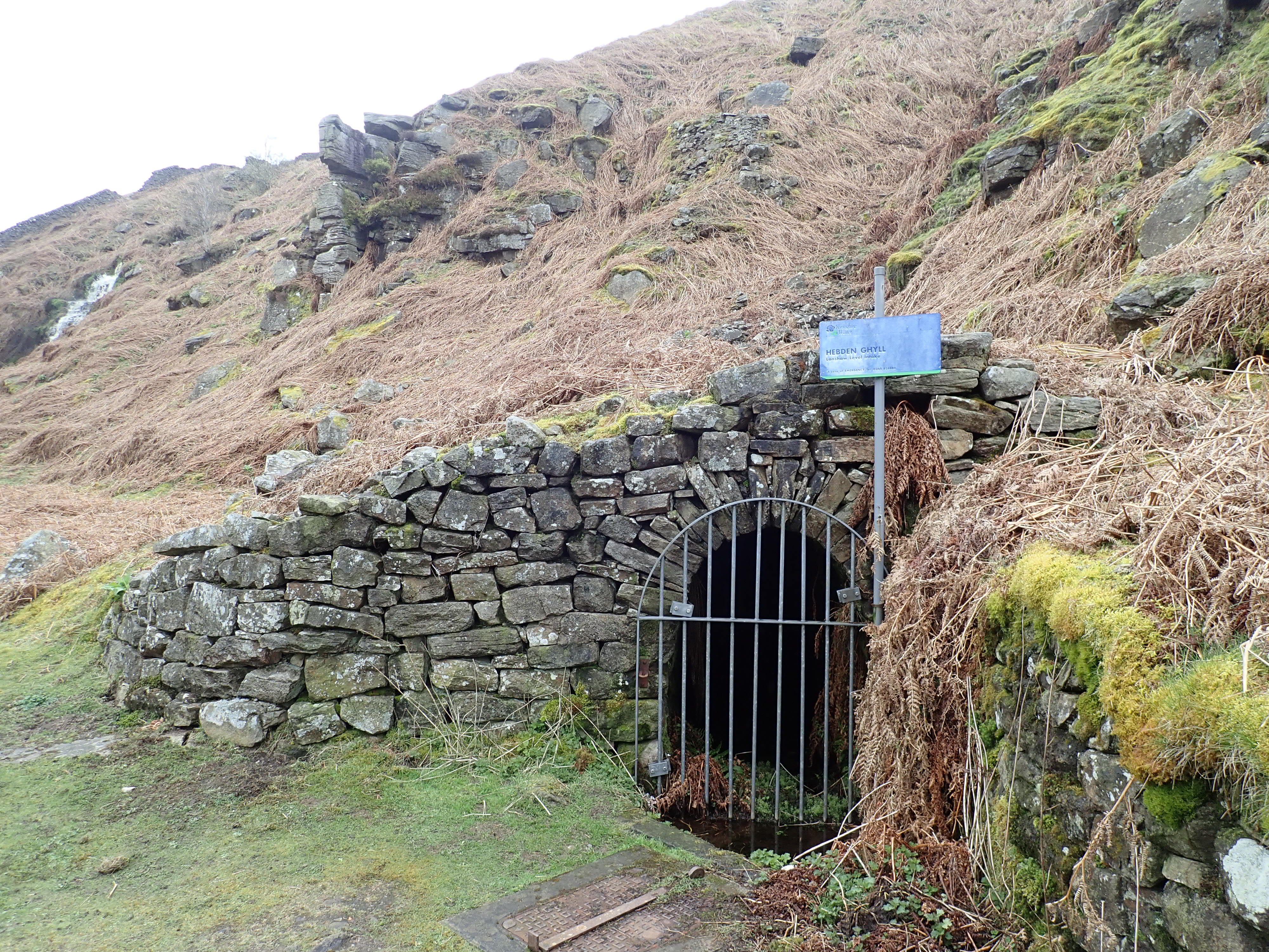 I enjoyed walking along this valley. The beck, woods, drystone walls, and fields are attractive. It’s also a varied route and full of interesting features such as tumbling-down crags and mining remnants. After a few minutes of walking along it, I came to a short section of drystone wall in which there was an archway into a dark tunnel into the hillside. A metal gate was bolted over this, and an adjacent Yorkshire Water sign stated that this was the “Hebden Ghyll; Lanshaw Level Intake”. It looked like an adit (i.e. a horizontal mining tunnel), and so I was puzzled by the sign describing it as a water intake. I was sufficiently intrigued to do an internet search when I got home, and found answers on a website devoted to the history of Hebden. This explains that this is an adit leading into Longshaw Level – a lead mine excavated in about 1863. The miners inadvertently hit a small stream, and the mining company decided to put the water to use by piping it down the valley to power the waterwheel in Hole Bottom. It went on to explain that by the early 1960s, Hebden’s rising population and a new, mains sewage system created a need for more water for the village. The Craven Water Board apparently decided this could come from this adit, and undertook construction work (including a water treatment plant) to put this into action. The Hebden history website states that there were complaints that the water piped to Hebden was excessively hard and in “the end it was deemed unwise to be pouring water from a lead mine down the throats of the locals…” This approach to supplying drinking water was therefore abandoned, and a mains supply was installed instead.