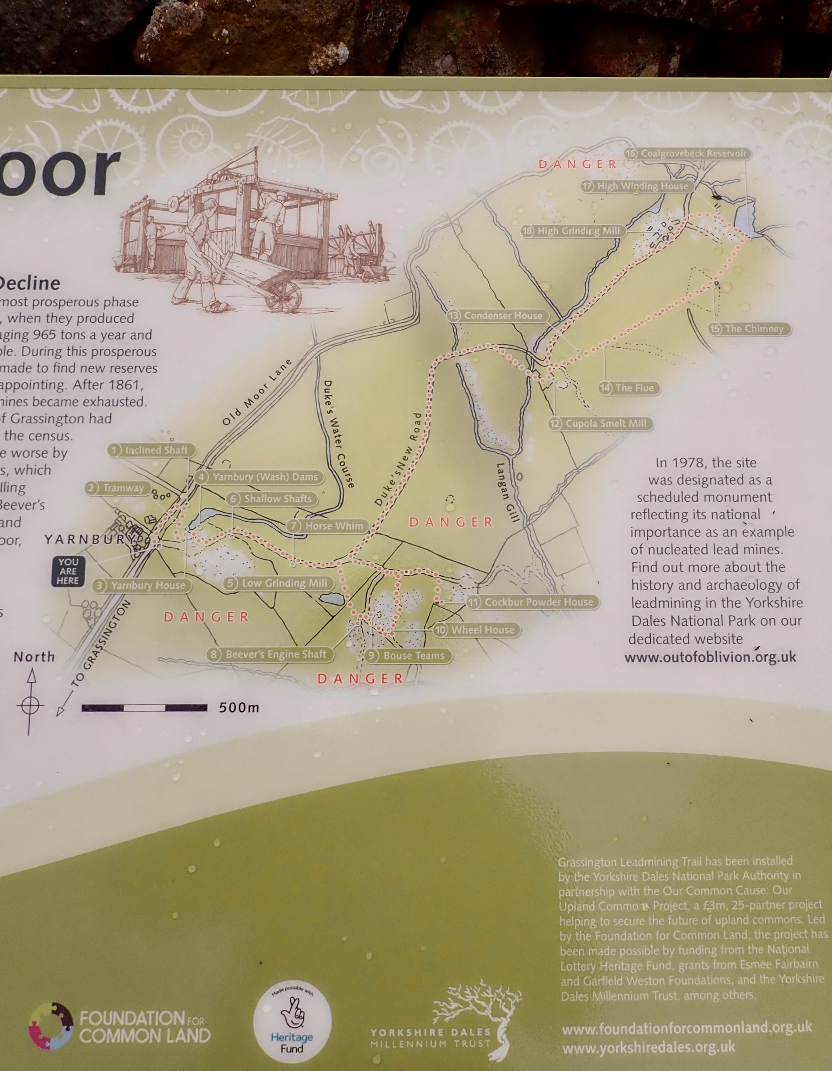 The Grassington Moor Lead Mining Trail shown on an information board at Yarnbury.