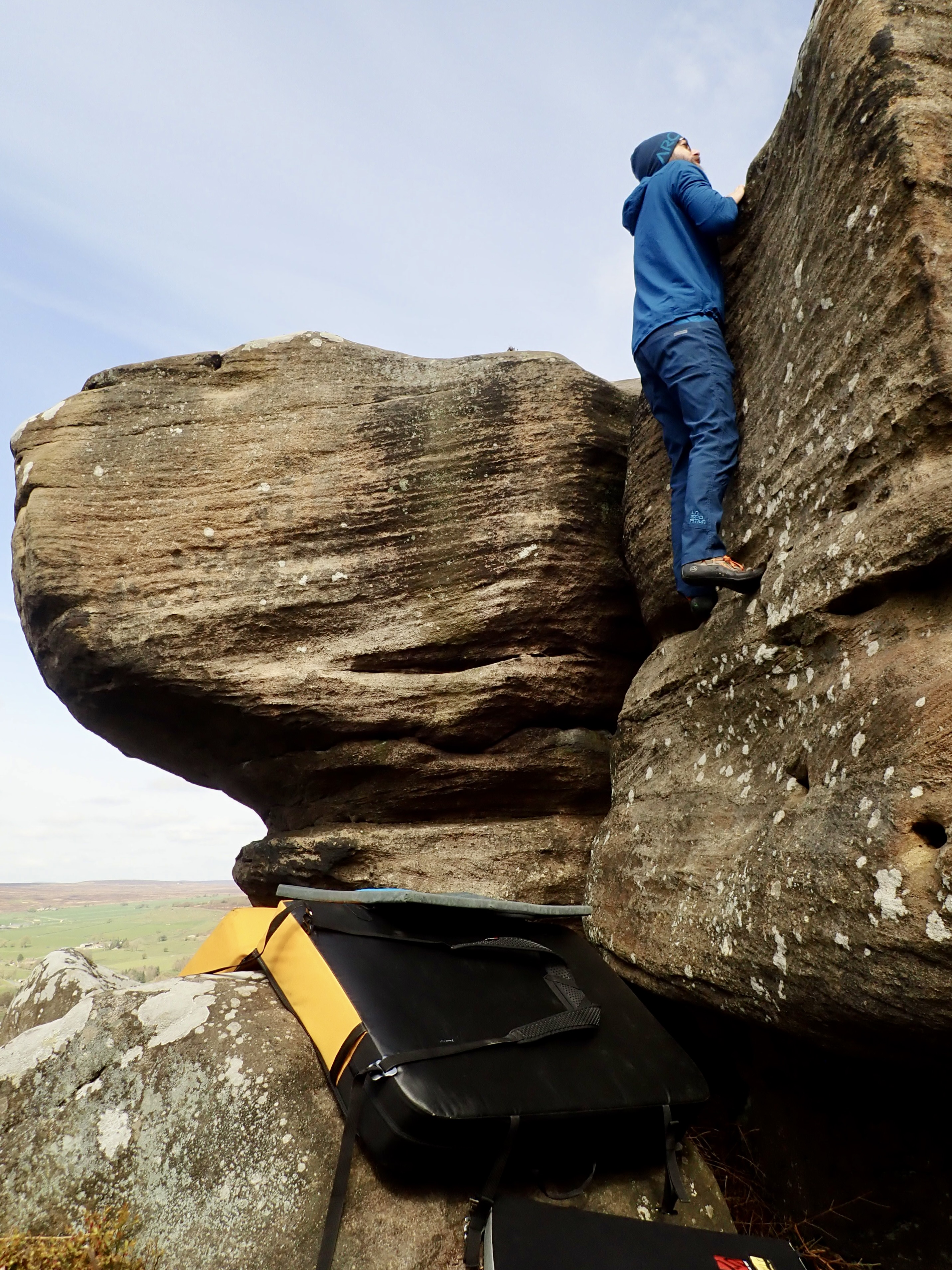 I was keen to return to the Pinky area of Brimham, where there is a gorgeous, rippled wall of rock with views over the moor and Nidderdale. There is an easier problem that goes up the centre of this wall called Raspberry Ripple (graded 4) that I wanted to try. I was confident I could get up it as I had climbed the same sort of rock waves on two other problems on this face. However, after several attempts to climb Raspberry Ripple, I had only managed to get a couple of moves off the ground. I kept retreating to my mat to see if I could work out what I was doing wrong. In the end, I resorted to the lazy option of relying on my height and stretched for a hold on the top of the wall. This didn’t work the first time, but I persevered, and, with the higher hold giving me the confidence to work my feet up the wall, managed to top out. That inelegant effort enabled me to complete the only problem I finished that day.