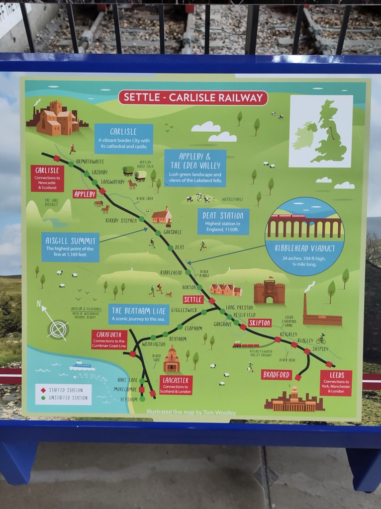 A sign in Leeds Station showing the route of the Settle-Carlisle Railway.