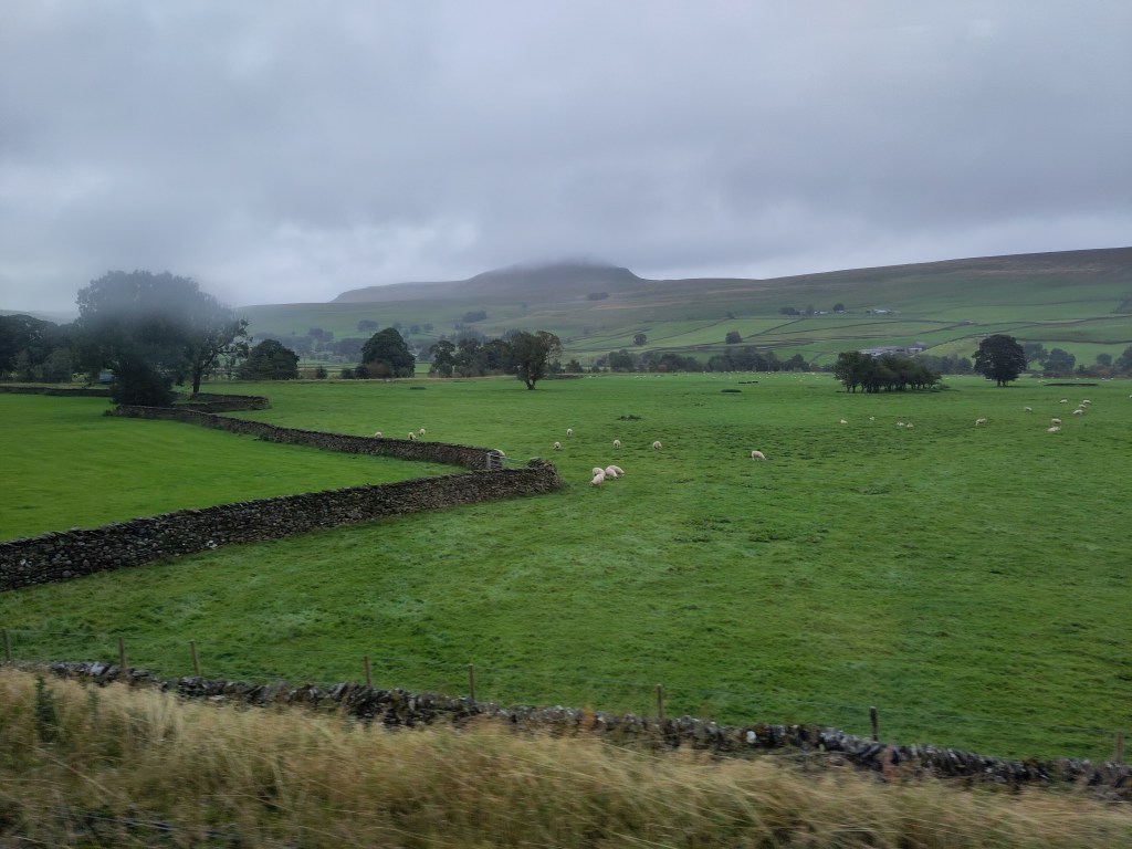 The Settle-Carlisle Railway was fantastic. There is an amazing variety of interesting and attractive things to see as the train heads through Yorkshire. The sights included old mills, green pastoral valleys, rivers, small towns, sheep grazing in fields bounded by drystone walls, moorland, limestone pavement and outcrops, and the peak of Pen-y-Ghent.