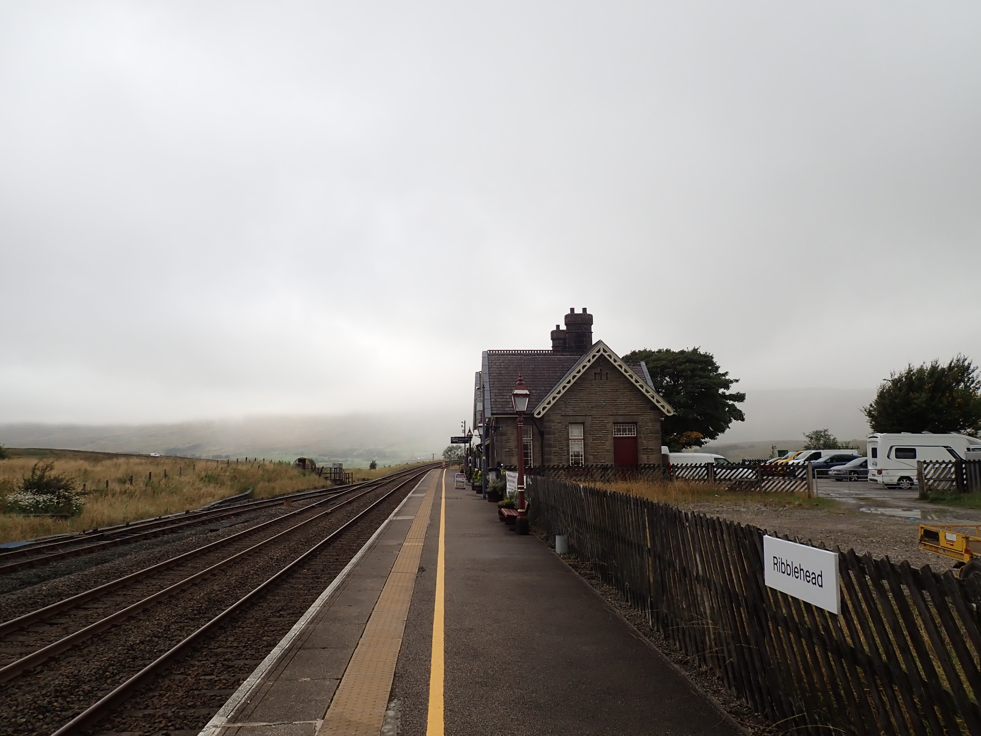 When I stepped onto the platform at Ribblehead there was low cloud, light rain, and a strong, cold wind. Looking along the length of the platform, I could see the slopes of Whernside, partly obscured by cloud. Despite the somewhat bleak weather, I was excited and eager to get going. I crossed the tracks and exited the station to walk down to the road.