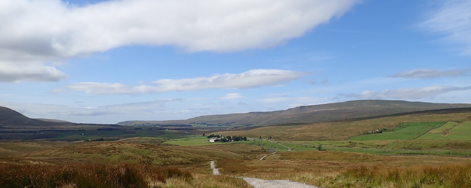 Looking back to Whernside and the Ribblehead Viaduct from the track over Cam Fell.