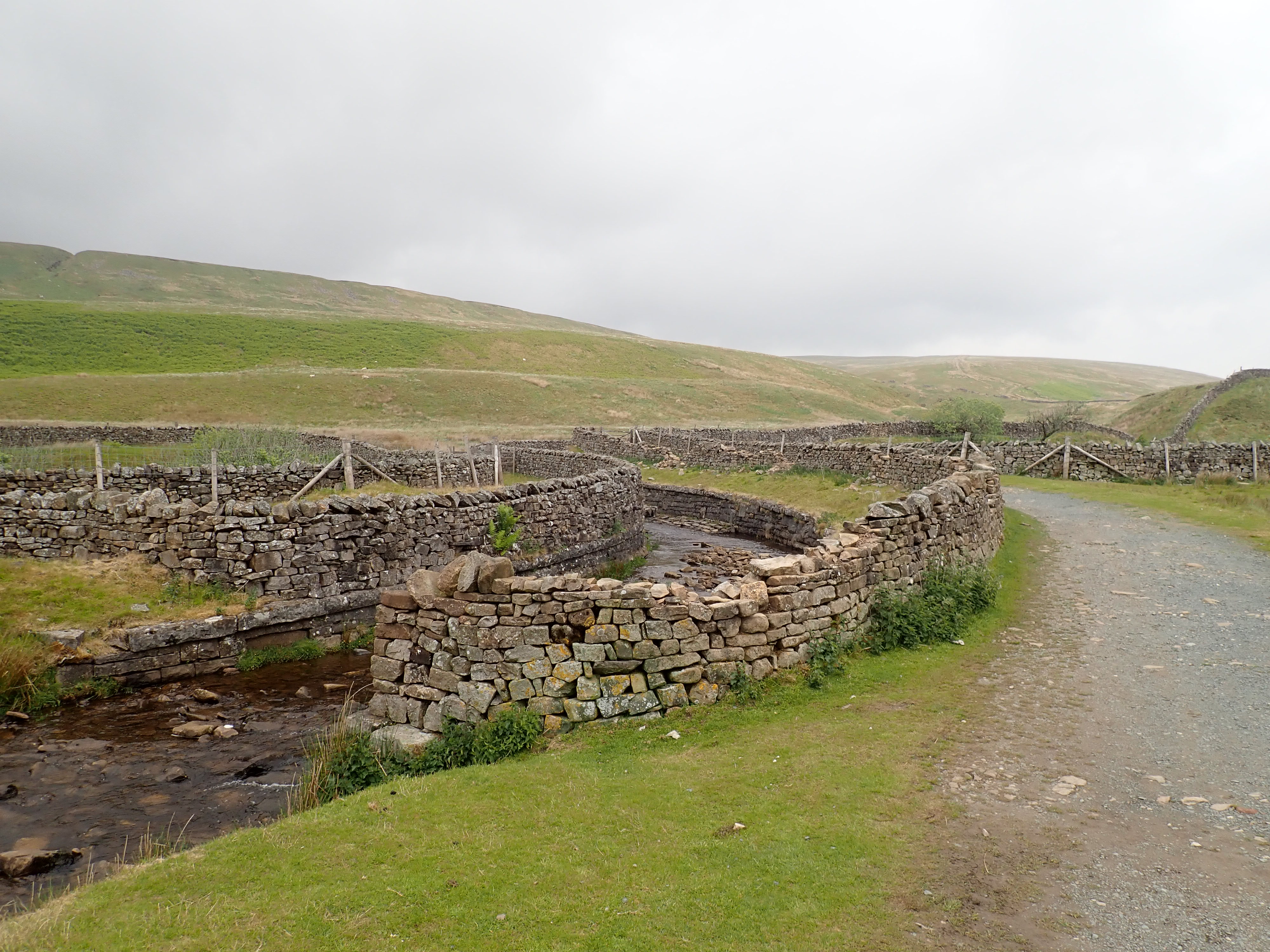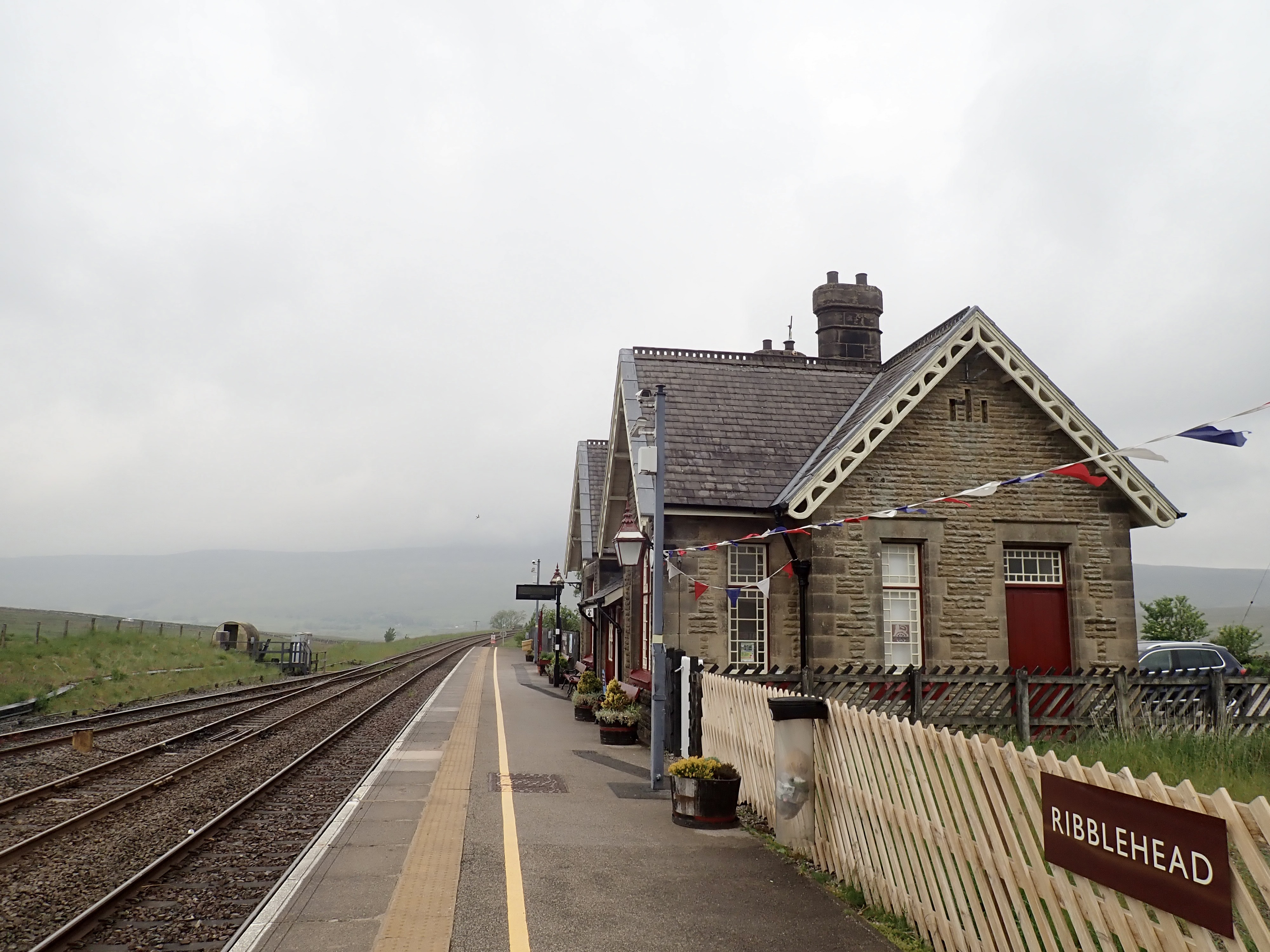 The start of my mini-adventure was the always brilliant train trip from Leeds to Ribblehead along the Settle to Carlisle line. I passed towns with buildings of weathered gritstone, former mills, green pastures enclosed by drystone walls, and old stations of stone with canopies of glass and painted cast iron. Nearer the end of my journey, the railway line followed Ribblesdale, close to the river Ribble, and with rounded peaks on both sides. The sky became depressingly grey and light rain began to fall as I passed moorland and limestone pavement, with Pen-y-Ghent in the distance. When I got off the train at Ribblehead, the top of Whernside was hidden by a haze of low cloud that dampened my expectations of seeing good views on my walk. Trying to be hopeful, I set off out of the station and down the track to the road.