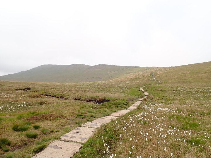 Common Cotton-grass next to the trail, with the summit of Whernside in the distance.