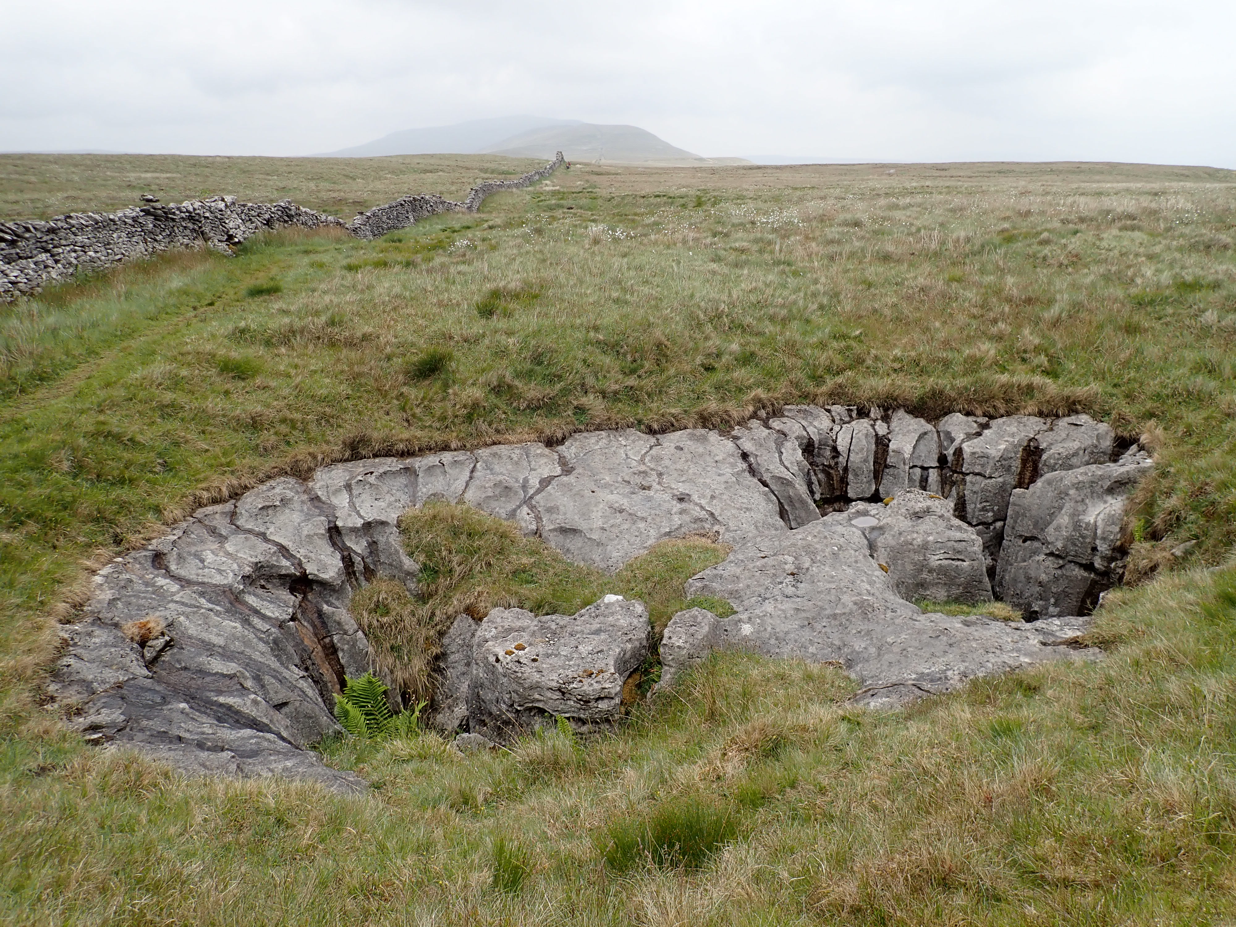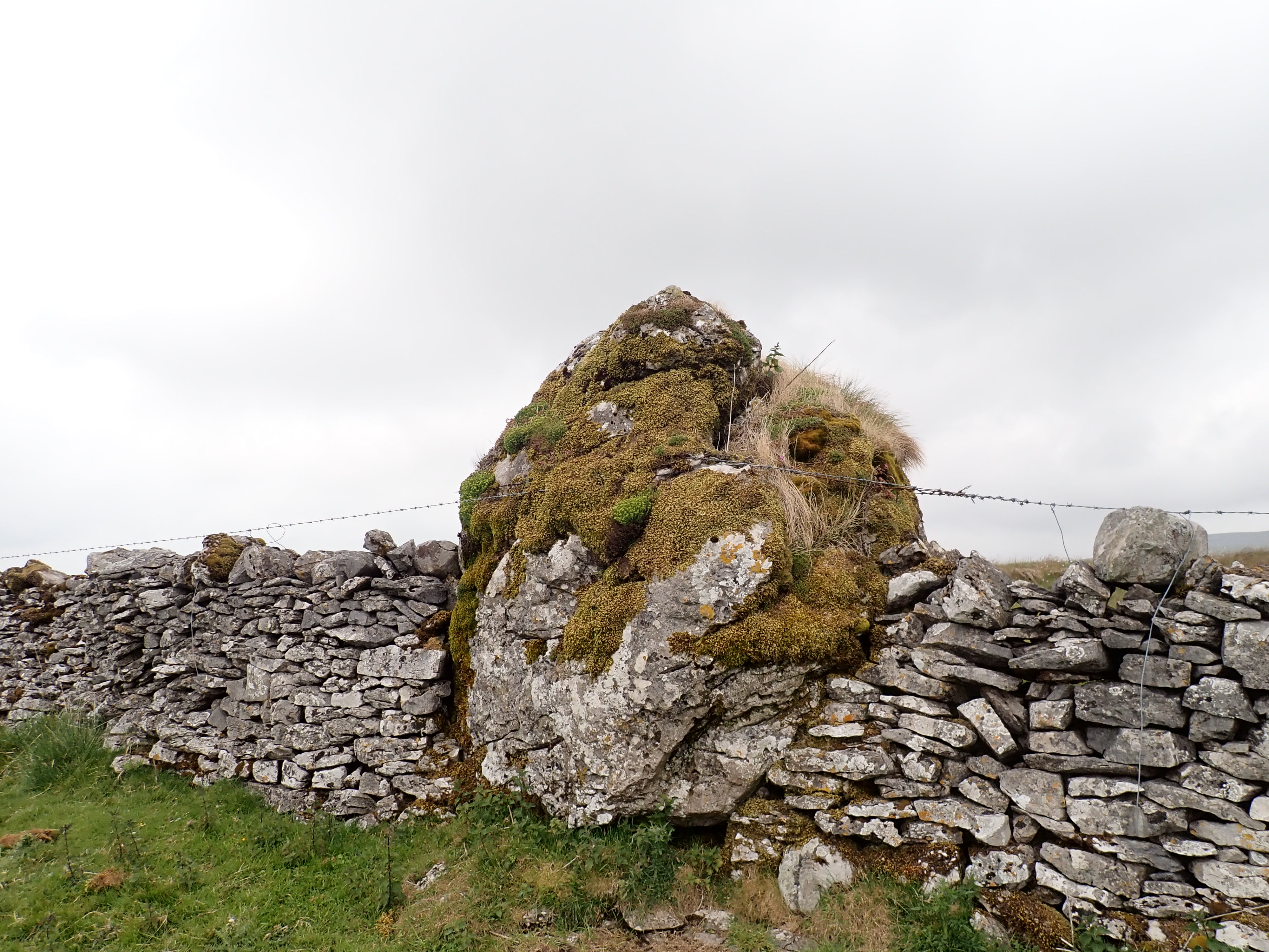 The ridge was covered in shake holes, many close to the path. As I got closer to the limestone pavement of Twisleton, there were boulders scattered across the moor with sheep slowly grazing between them. A particularly large boulder had been incorporated into the drystone wall, and it was an impressive sight. Patches of grass and thick moss covered its rugged top while barbed wire wrapped around it as if it were an errant troll that had needed to be restrained.