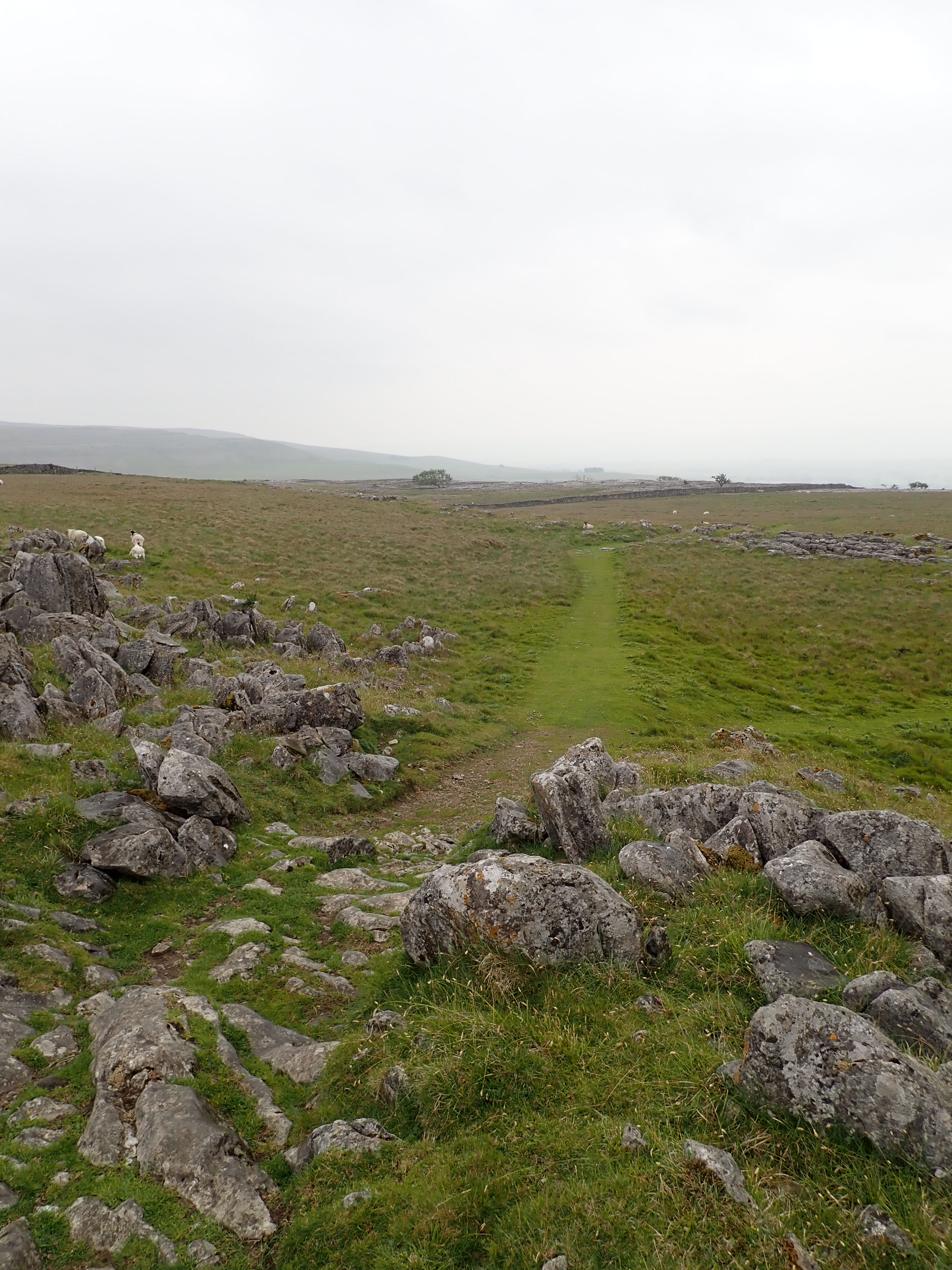 It started to rain as I reached the part of the ridge that was largely covered in limestone pavement. While I think limestone pavement is wonderous, it was probably the reason I lost my route and ended up following a sheep track for a while before having to backtrack to pick up the path as it veered away from the wall.